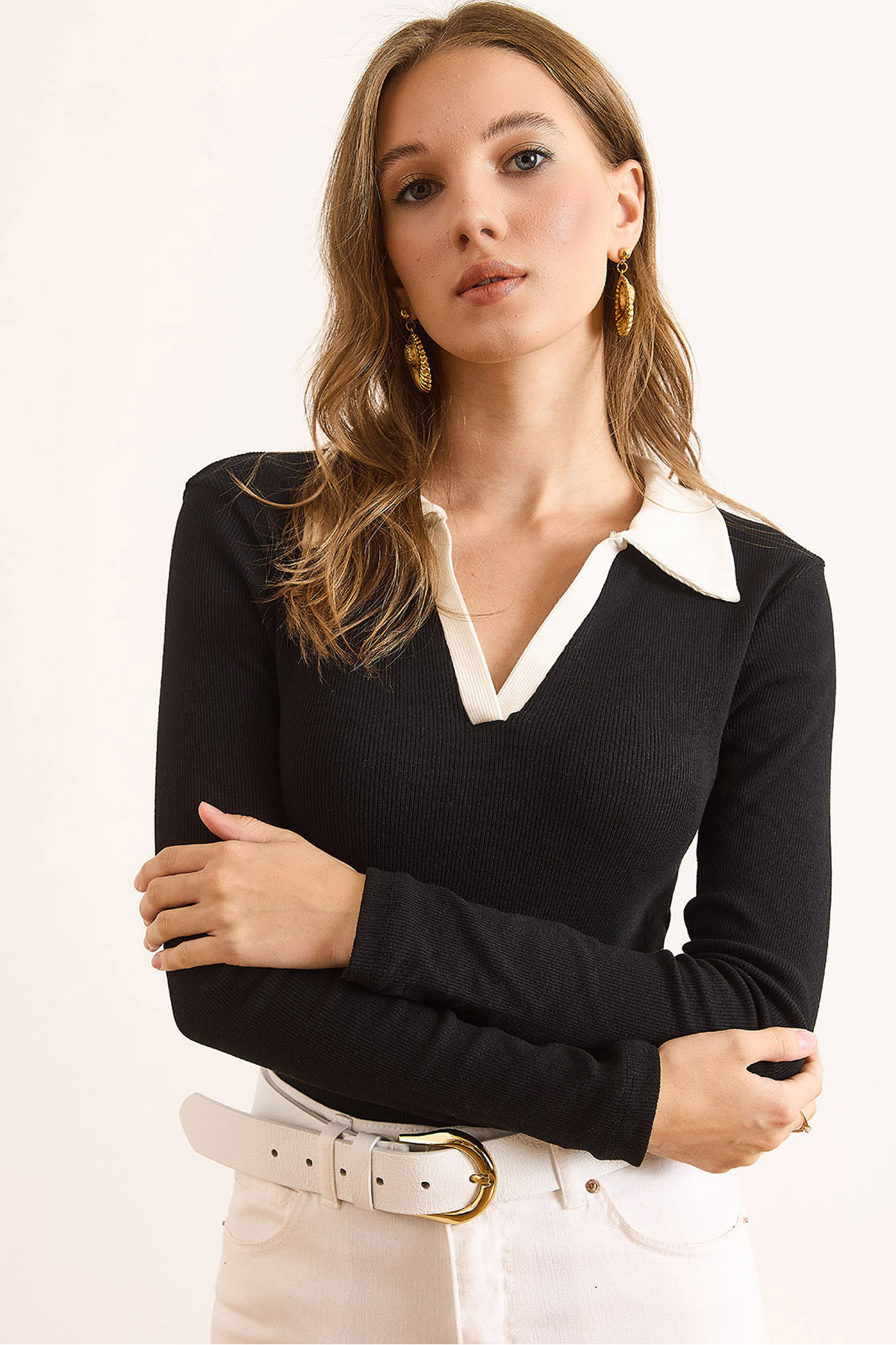 Kadın Kahverengi Bej Renk Bloklu Polo Yaka Pamuk Esnek Bluz BLZ-19003104 Kadın Kahverengi Bej Renk Bloklu Polo Yaka Pamuk Esnek Bluz BLZ-19003104 XL