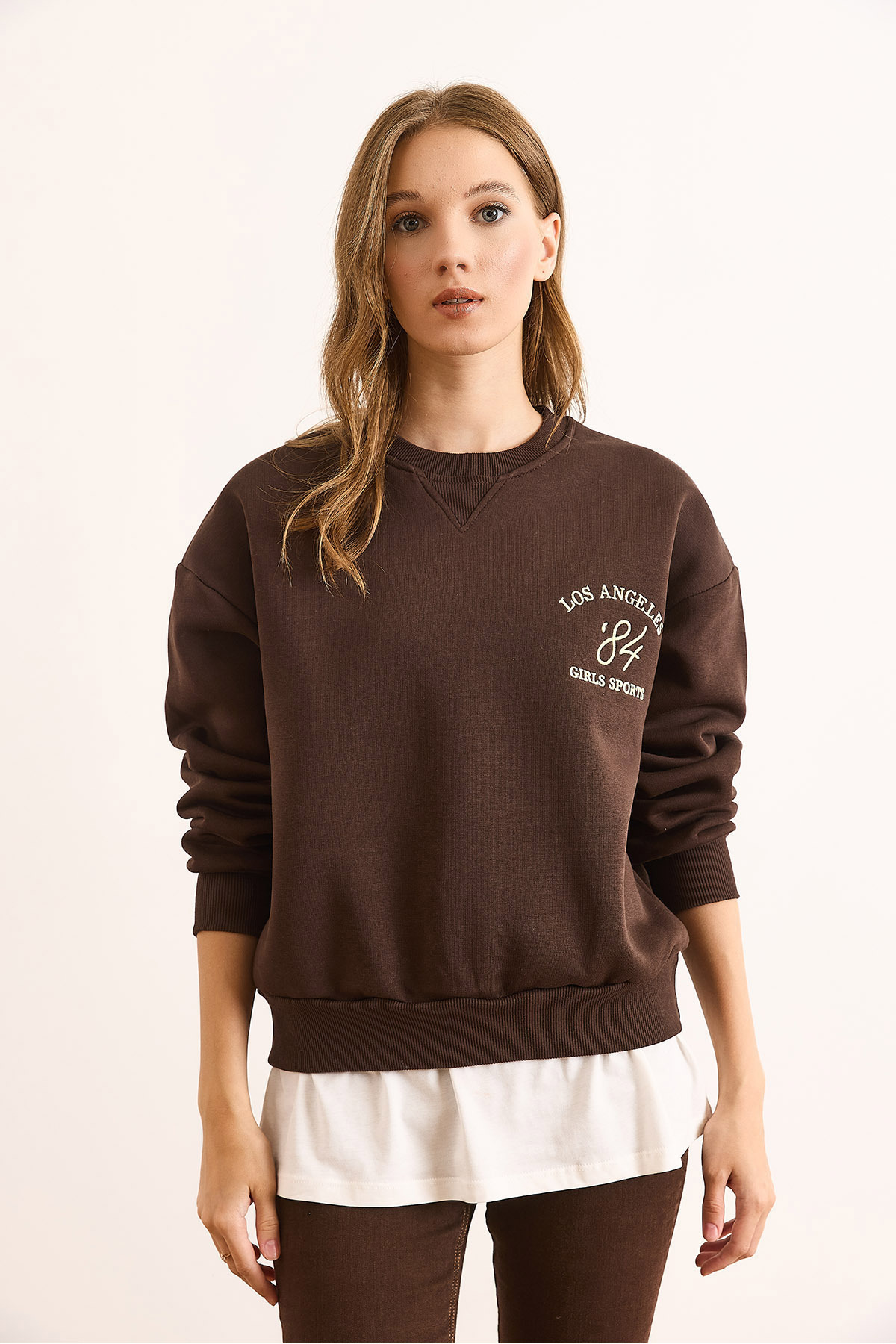 Kadın Kahverengi Eteği Garnili Yaka Detaylı Şardonlu Kalın Sweatshirt SWT-19000743 Kadın Kahverengi Eteği Garnili Yaka Detaylı Şardonlu Kalın Sweatshirt SWT-19000743 L