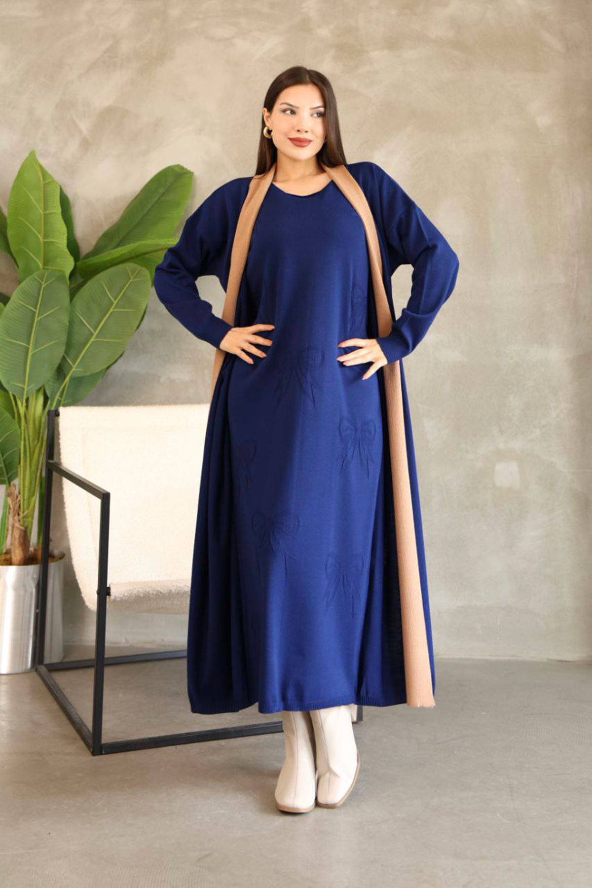 Kadın Lacivert Bisiklet Yaka Elbise Ve Hırka Tesettür Alt Üst Takım BCES-252024 Kadın Lacivert Bisiklet Yaka Elbise Ve Hırka Tesettür Alt Üst Takım BCES-252024 Standart