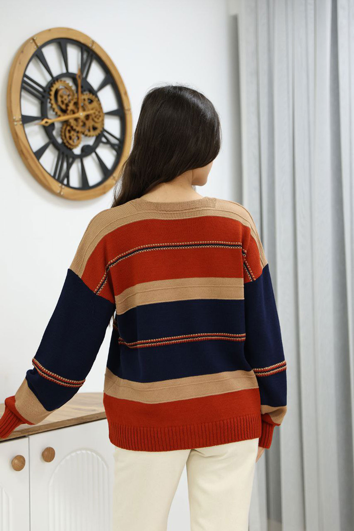 Kadın Lacivert V Yaka Çizgi Bloklu Triko Kazak BCES-252018 Kadın Lacivert V Yaka Çizgi Bloklu Triko Kazak BCES-252018 Standart