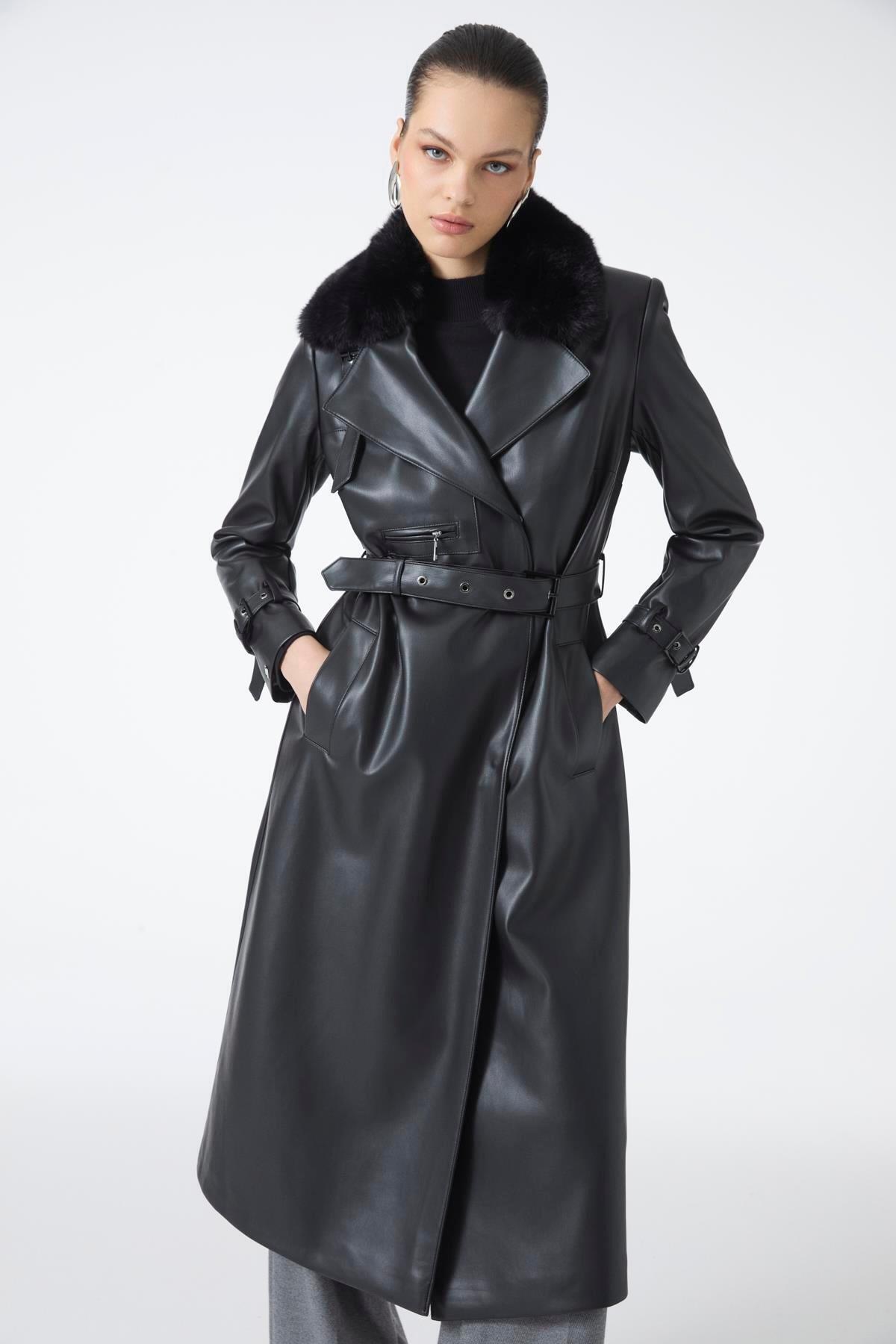 Kürk Yaka Kemerli Deri Siyah Trençkot 14017 Kürk Yaka Kemerli Deri Siyah Trençkot 14017 44