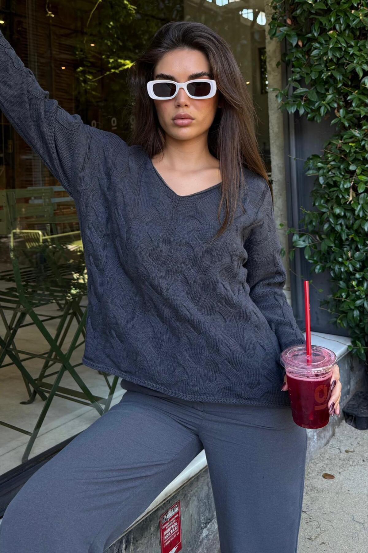 Antrasit V Yaka Örgü Desen Oversize Kadın Kazak Mg2519 Antrasit V Yaka Örgü Desen Oversize Kadın Kazak Mg2519 L