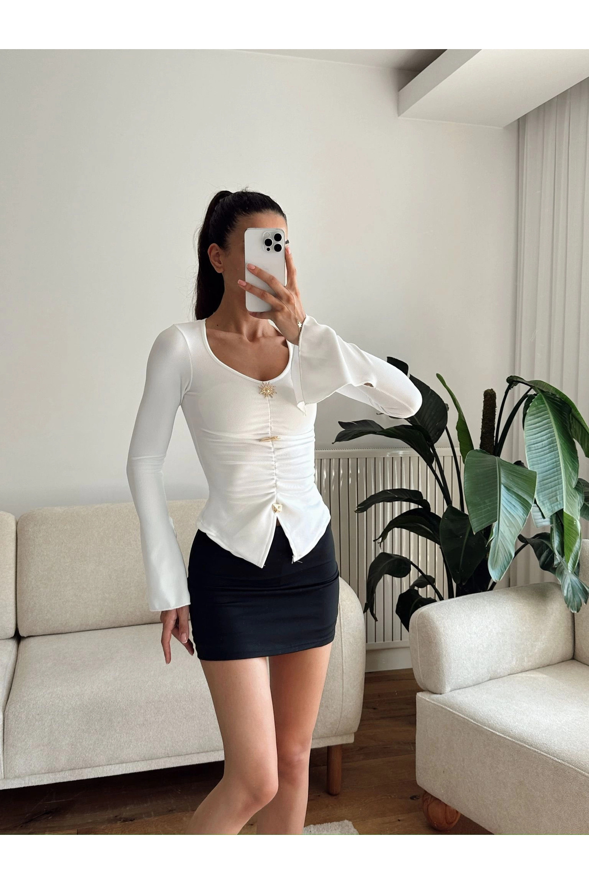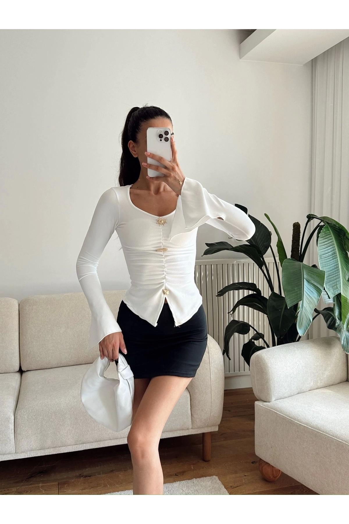 Kolları Volanlı Aksesuar Bluz - BEYAZ Kolları Volanlı Aksesuar Bluz - BEYAZ P18216S6310 L