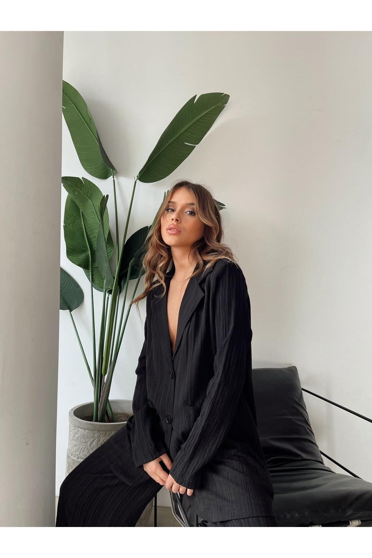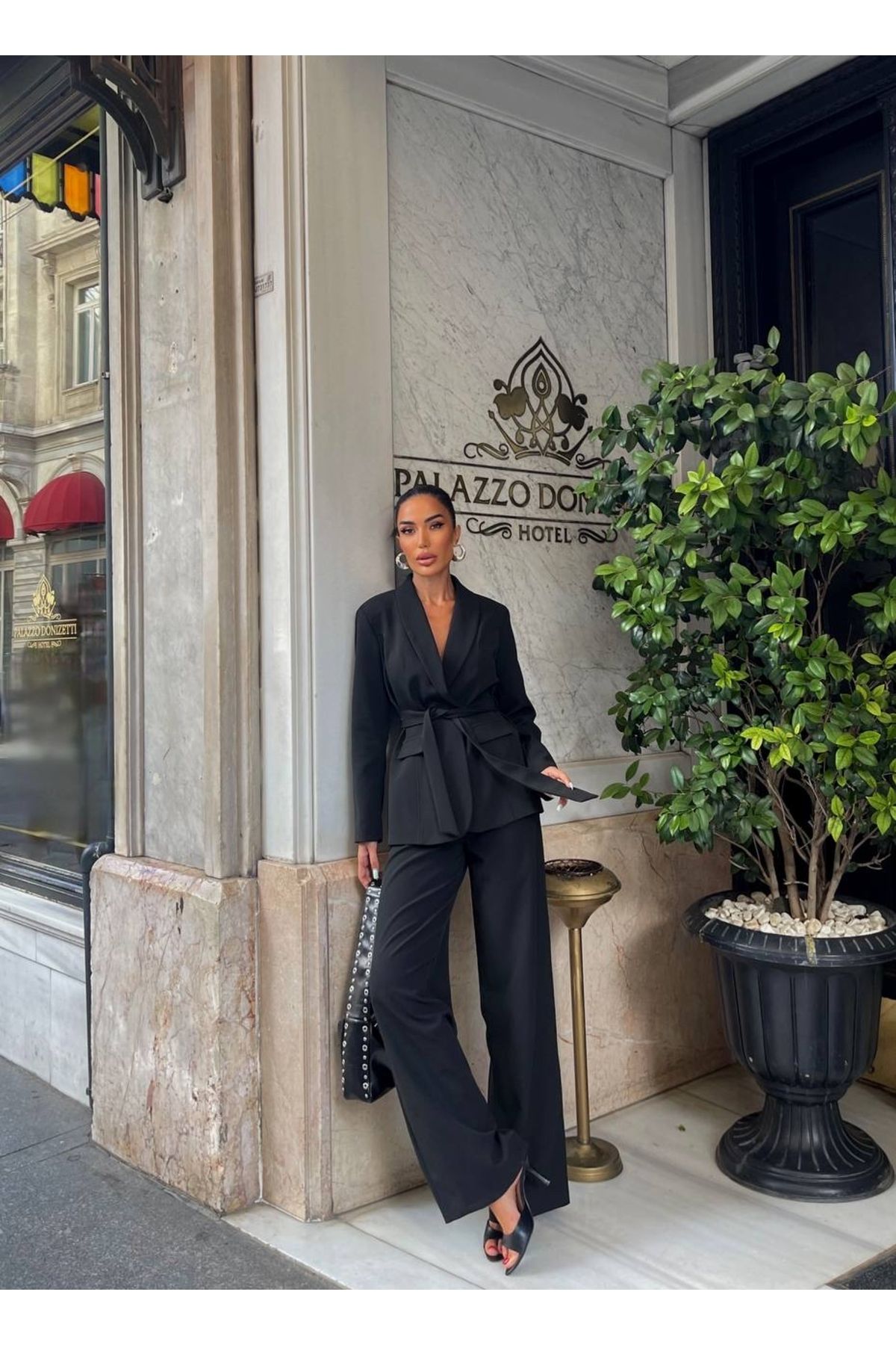 Siyah Beli Kuşaklı Ceket ve Pantolon Parlak Takım Siyah Beli Kuşaklı Ceket ve Pantolon Parlak Takım 8290 L