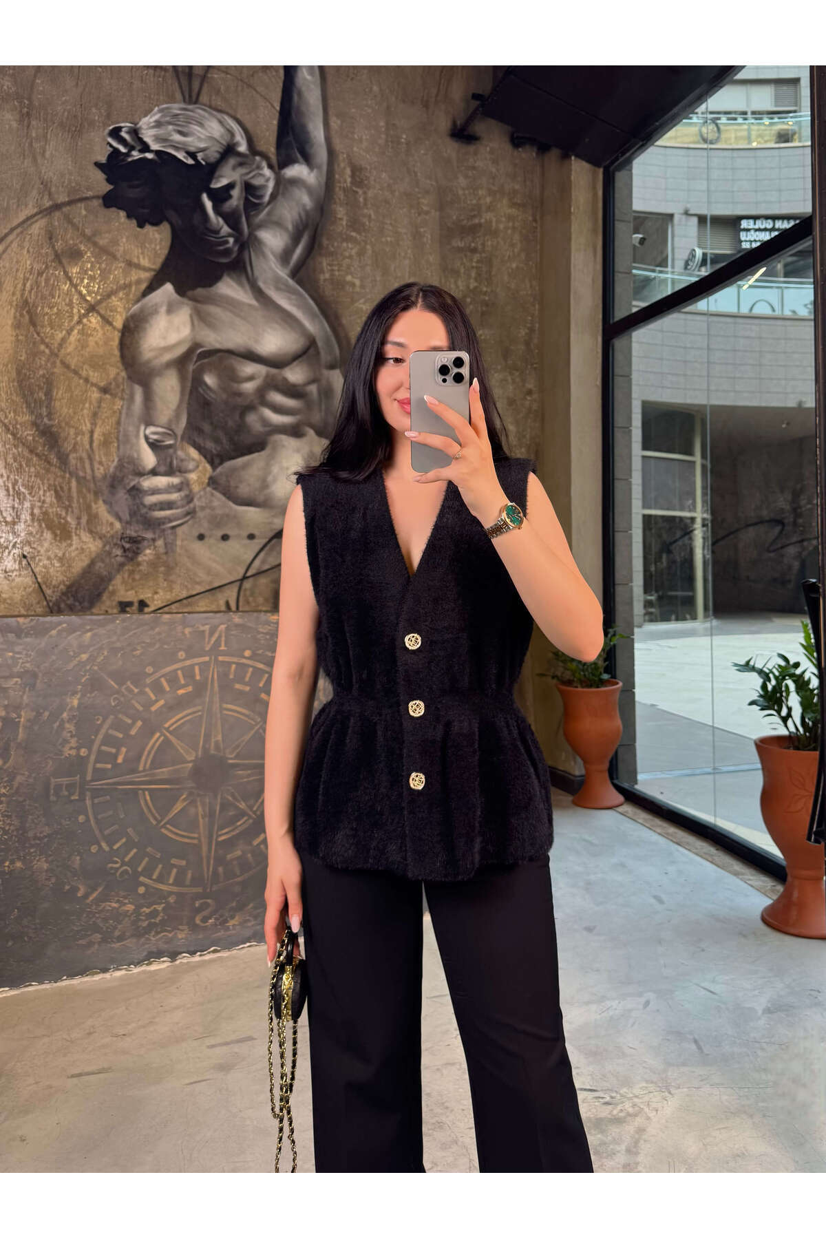 Anna Gold Düğmeli Bel Detaylı Angora Yelek Siyah Anna Gold Düğmeli Bel Detaylı Angora Yelek Siyah MSJJ1029 Standart