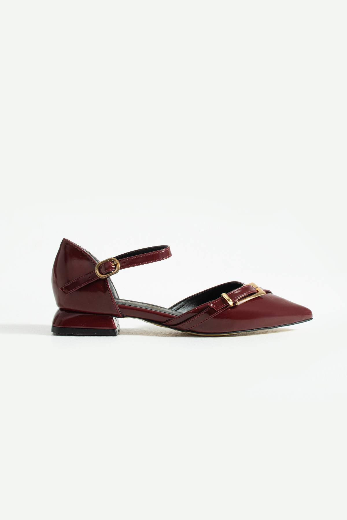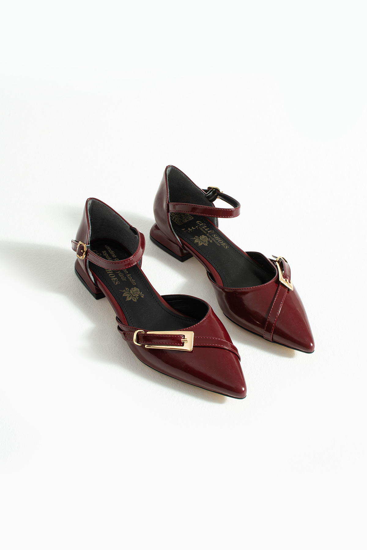 Bordo Rugan Bilekten Bağlamalı Altın Tokalı Sivri Burun Düşük Topuk Kadın Babet Ayakkabı Bordo Rugan Bilekten Bağlamalı Altın Tokalı Sivri Burun Düşük Topuk Kadın Babet Ayakkabı 154 41