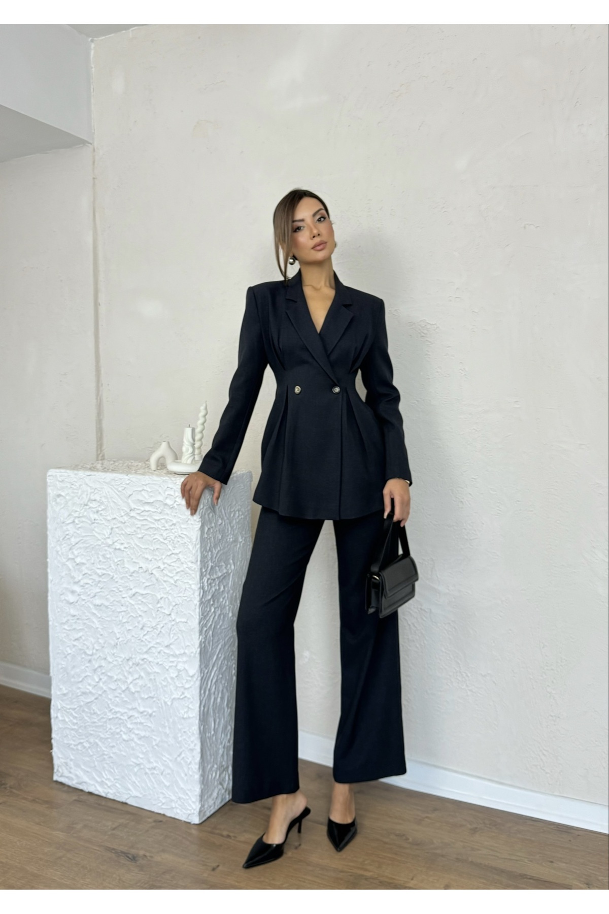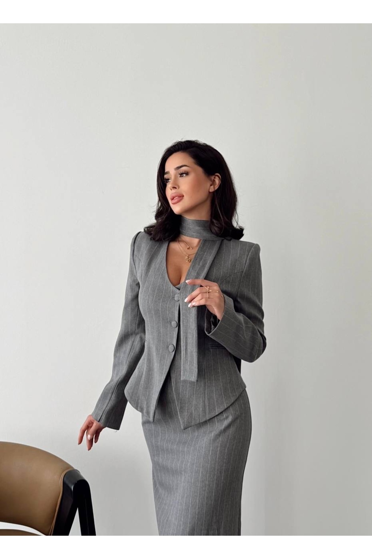 Çizgili Vatkalı Astarlı Boyun Aksesuarlı Ceket Etekli Kadın Özel Gün Günlük İkili Takım Çizgili Vatkalı Astarlı Boyun Aksesuarlı Ceket Etekli Kadın Özel Gün Günlük İkili Takım EU2105 XL