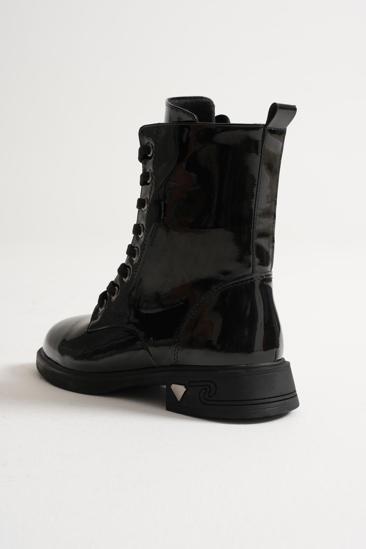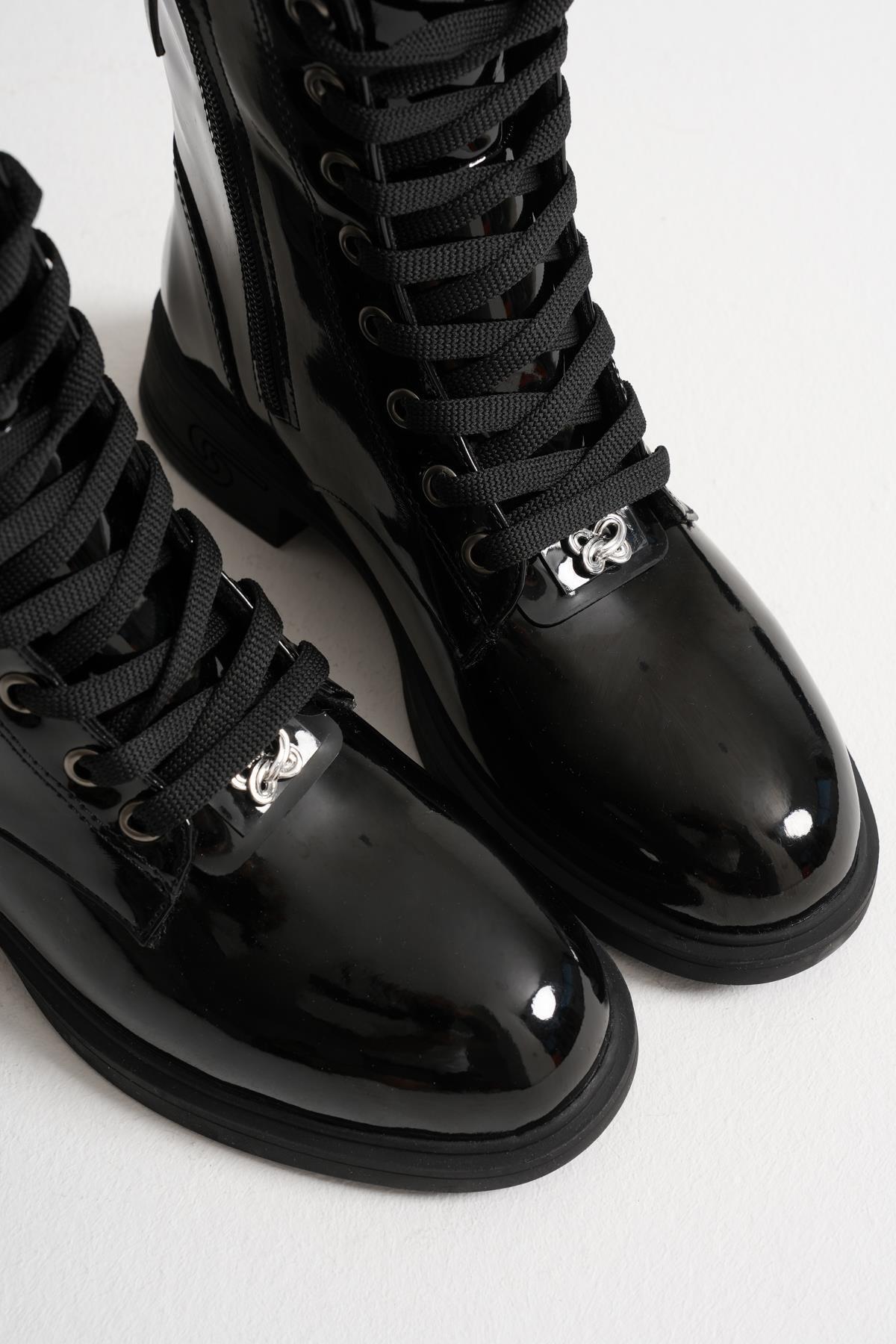 Kaela Kadın Siyah Rugan Fermuar Detaylı Bağcıklı Aksesuarlı Postal BOT Kaela Kadın Siyah Rugan Fermuar Detaylı Bağcıklı Aksesuarlı Postal BOT 52-04-5015 40