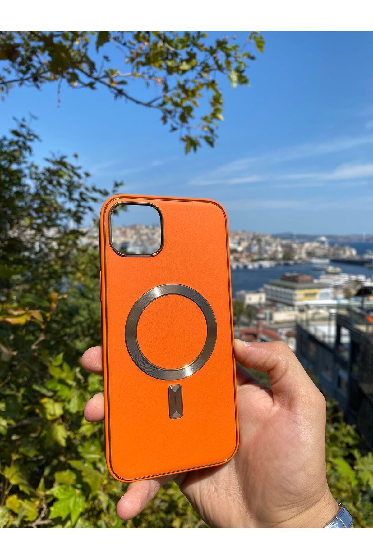 iPhone 14 Plus Ve 15 Plus Uyumlu Turuncu Kılıf Magsafe Özellikli Suni Deri Gold Çerçeveli Kapak iPhone 14 Plus Ve 15 Plus Uyumlu Turuncu Kılıf Magsafe Özellikli Suni Deri Gold Çerçeveli Kapak suni14pls تک سایز