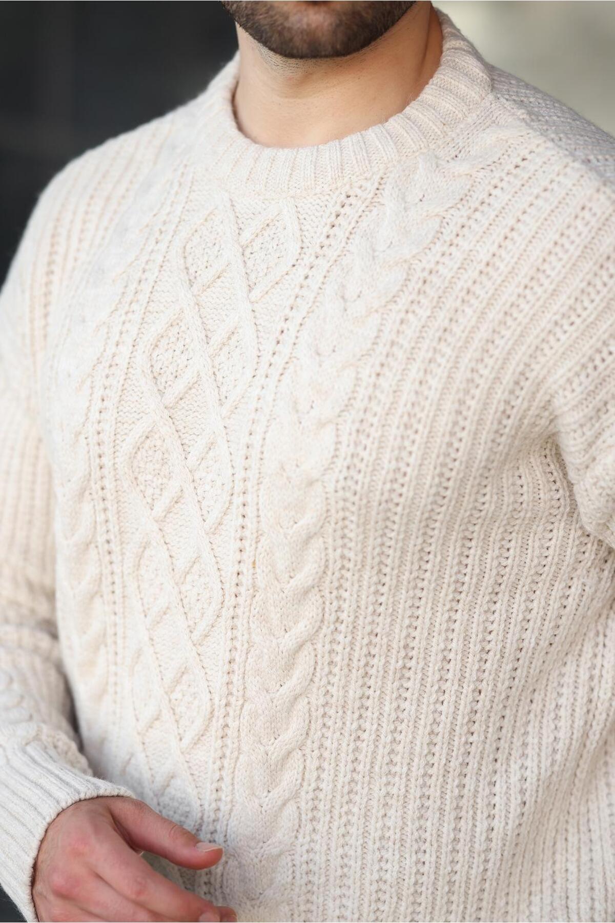 Ekru Örgü Desenli Triko Erkek Kazak E7425 Ekru Örgü Desenli Triko Erkek Kazak E7425 XL