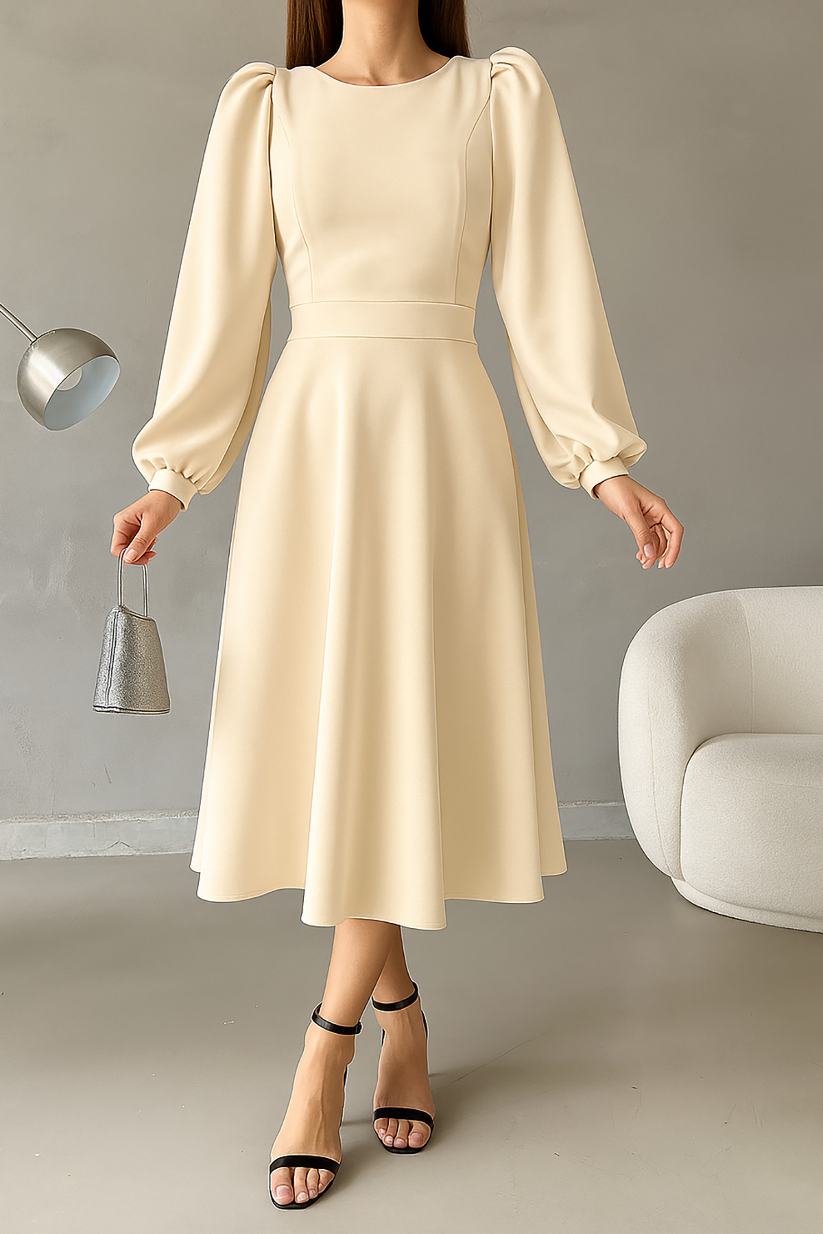 Siyah İnci Detay Yuvarlak Yaka Prenses Kol Bel Dekolteli Kendinden Kuşaklı Krep Kumaş Elbise Siyah İnci Detay Yuvarlak Yaka Prenses Kol Bel Dekolteli Kendinden Kuşaklı Krep Kumaş Elbise DFX393424 L