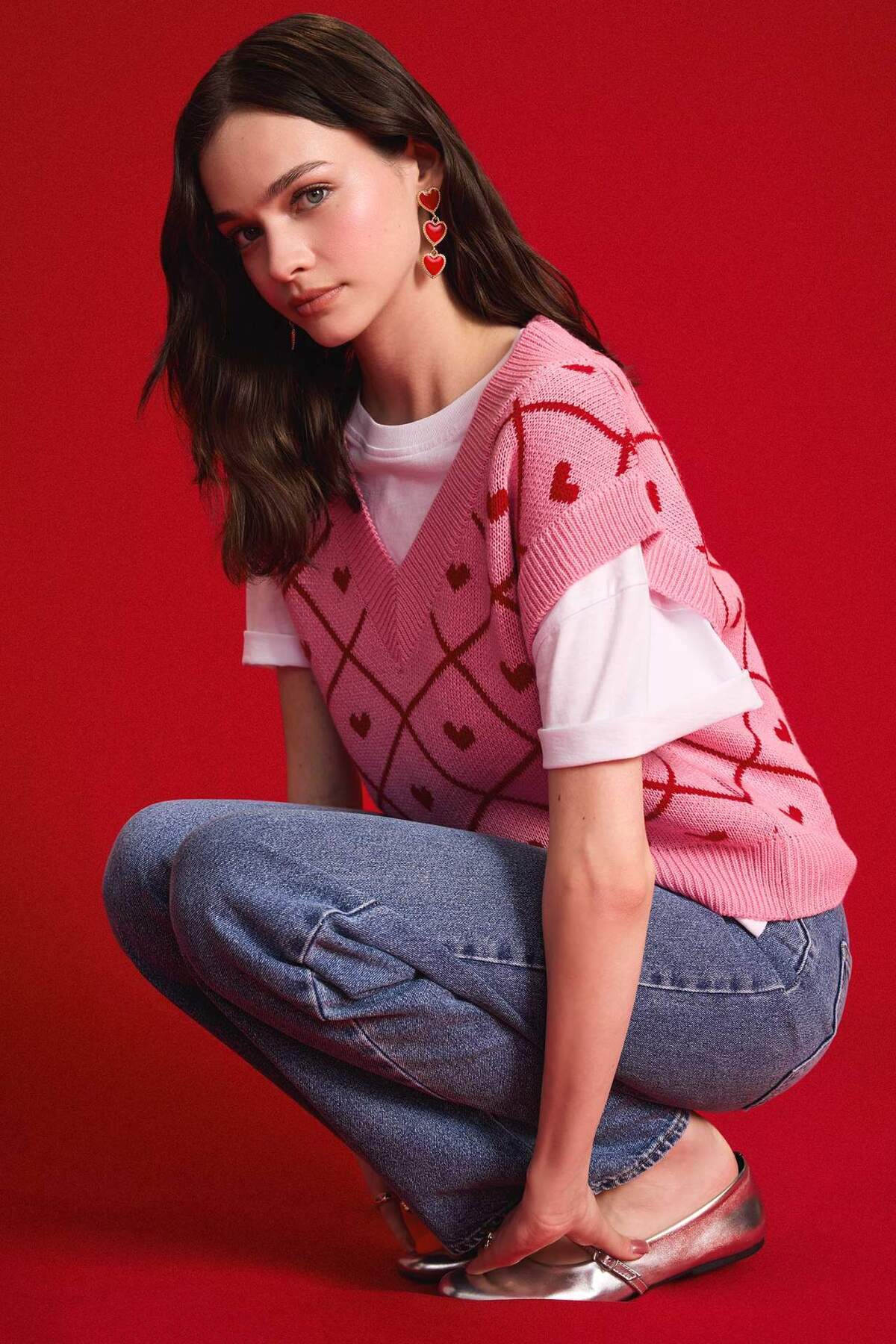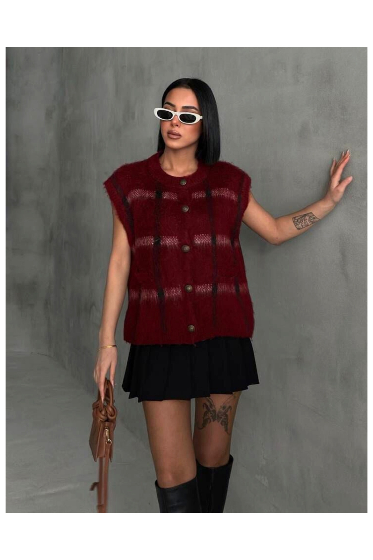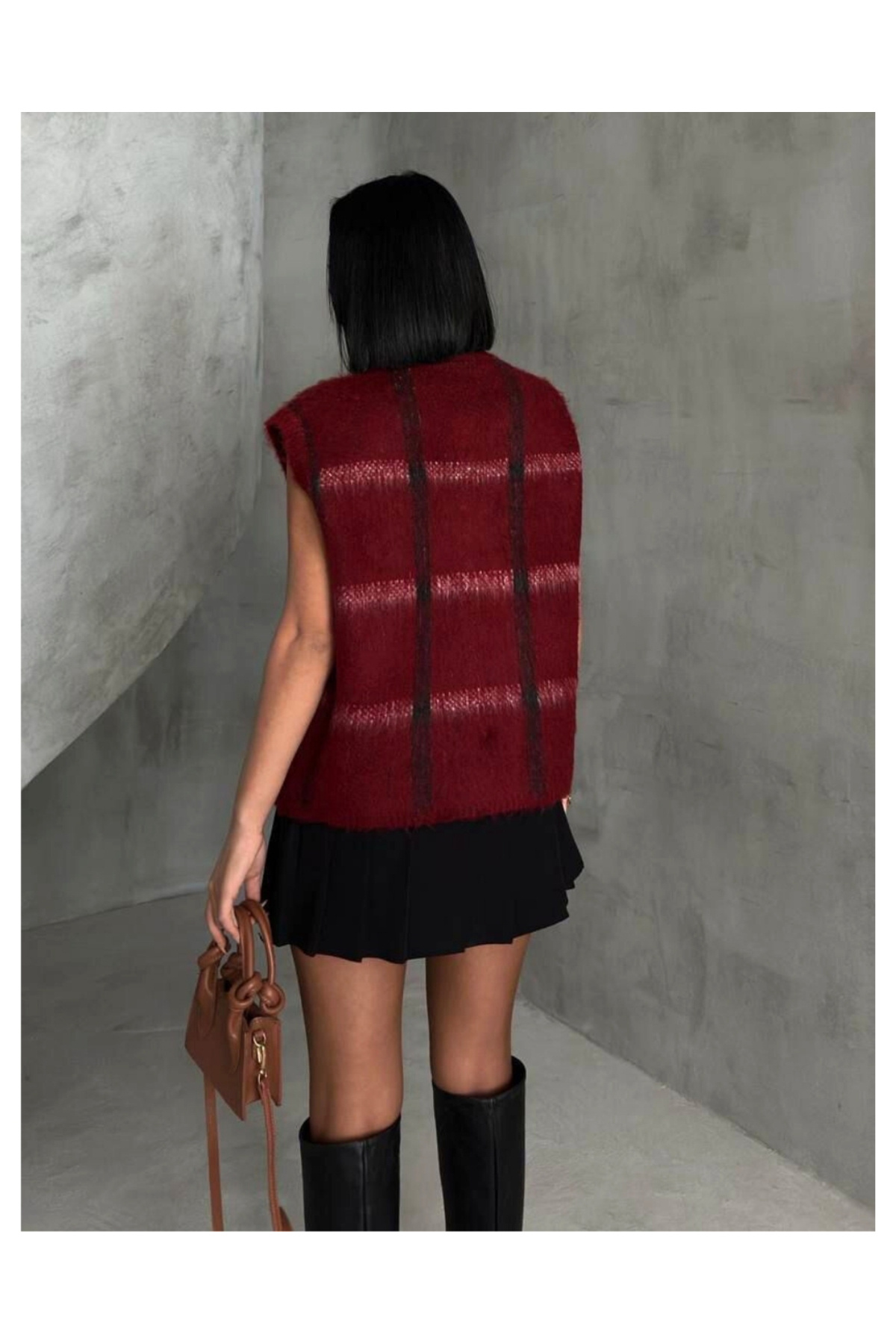 Kadın Bordo Ekose Oversize Triko Yelek Kadın Bordo Ekose Oversize Triko Yelek YLK07 Standart
