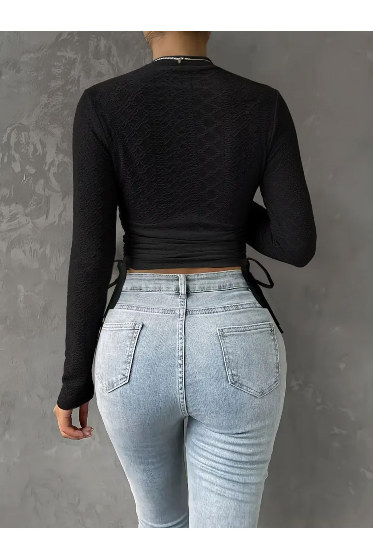 Siyah Dantel Desenli Uzun Kollu Crop Bluz,Siyah Nakış Desenli Yan Büzgülü Likralı Bluz,Şık Siyah Üst Siyah Dantel Desenli Uzun Kollu Crop Bluz,Siyah Nakış Desenli Yan Büzgülü Likralı Bluz,Şık Siyah Üst 2026-KIŞ-D01 XL