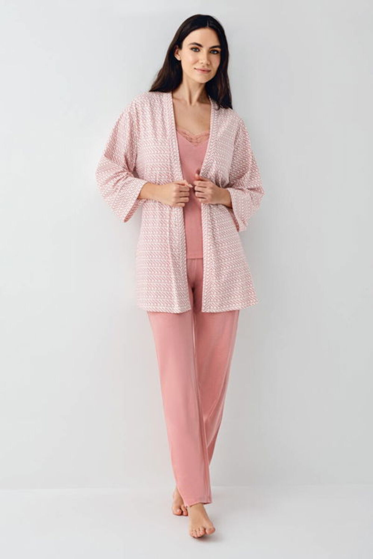 Üçlü Pijama & Sabahlık Set, Kurdele Bağlamalı, İp Askılı, V Yakası Dantelli, %50 Pamuk & %50 Modal Üçlü Pijama & Sabahlık Set, Kurdele Bağlamalı, İp Askılı, V Yakası Dantelli, %50 Pamuk & %50 Modal PC9C0C8C2C XL