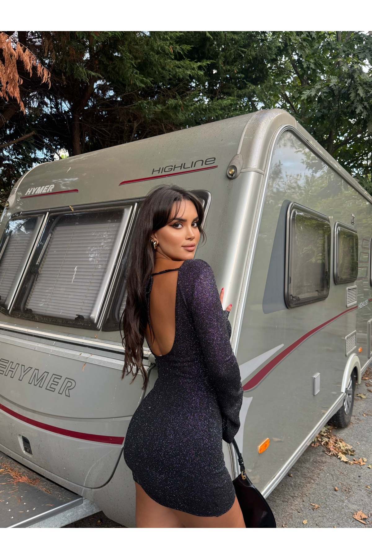 Siyah Sırt Detay Simli Elbise Siyah Sırt Detay Simli Elbise SİMLİUZUNKOL02 L