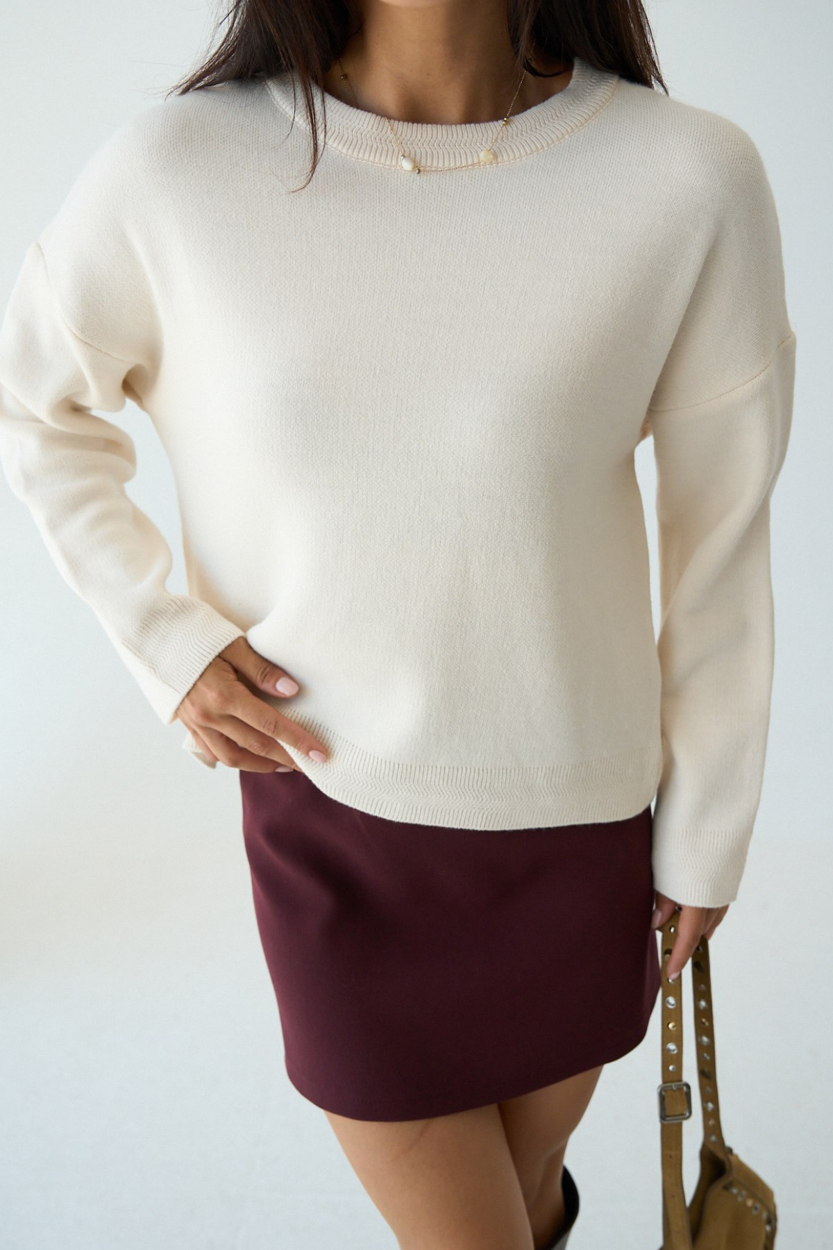 Kadın Krem Yuvarlak Yaka Dokulu Basic Kazak Kadın Krem Yuvarlak Yaka Dokulu Basic Kazak TK251052 Standart