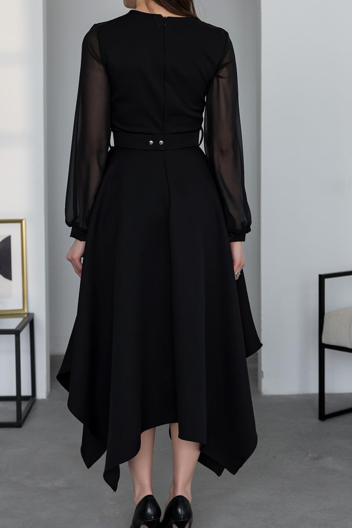 Asimetrik Kesim Yakası ve Kemeri Taş Detaylı Şifon Kol Siyah Elbise Asimetrik Kesim Yakası ve Kemeri Taş Detaylı Şifon Kol Siyah Elbise 50DKS1157 XL