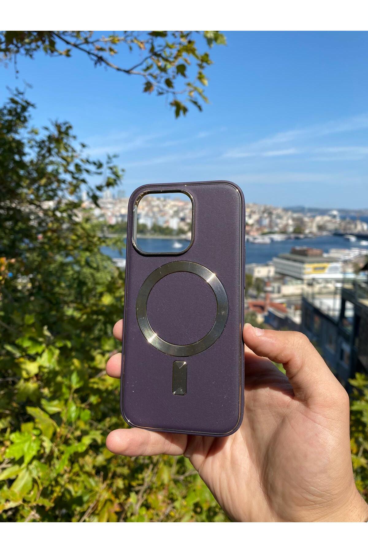 iPhone 14 Pro Uyumlu Mor Kılıf Magsafe Özellikli Suni Deri Gold Çerçeveli Kapak iPhone 14 Pro Uyumlu Mor Kılıf Magsafe Özellikli Suni Deri Gold Çerçeveli Kapak suni14p تک سایز