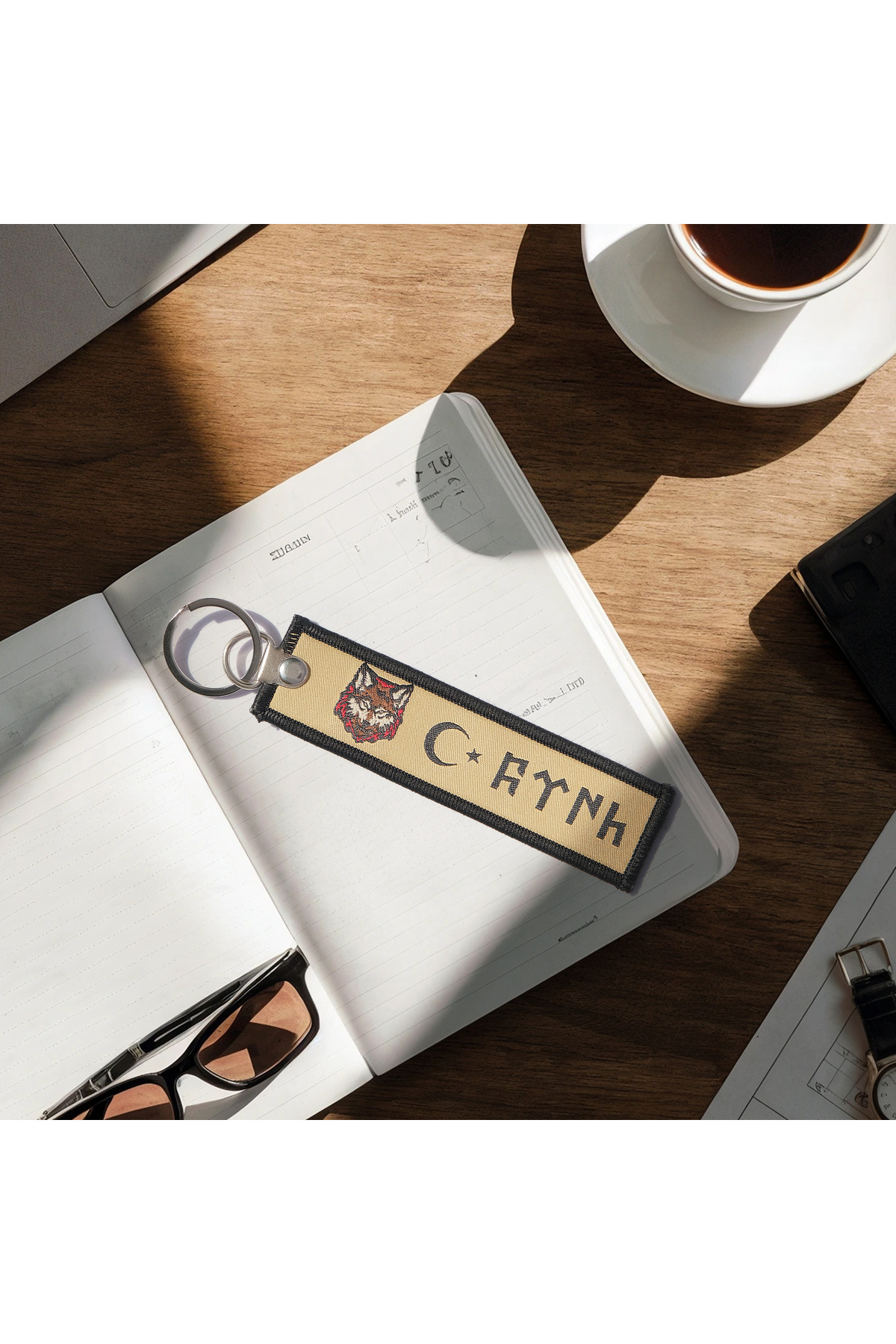 Ayyıldızlı Göktürkçe TÜRK işlemeli nakış sarı bez anahtarlık Ayyıldızlı Göktürkçe TÜRK işlemeli nakış sarı bez anahtarlık ayyıl تک سایز
