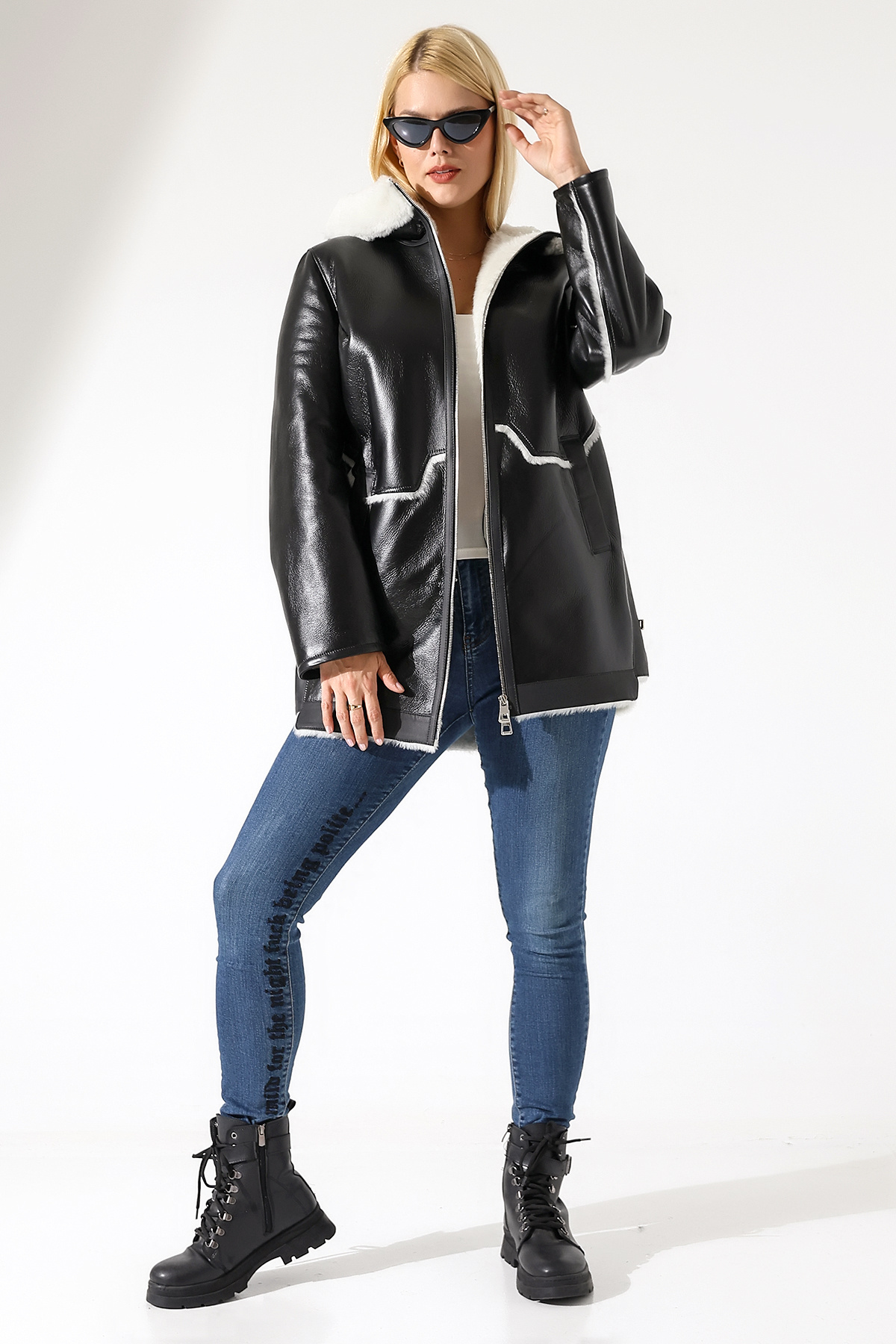 Kadın Hakiki Deri Kaban, Siyah, İçi Beyaz Kürklü, Kapüşonlu, 80 cm - 109922 Kadın Hakiki Deri Kaban, Siyah, İçi Beyaz Kürklü, Kapüşonlu, 80 cm - 109922 2XL