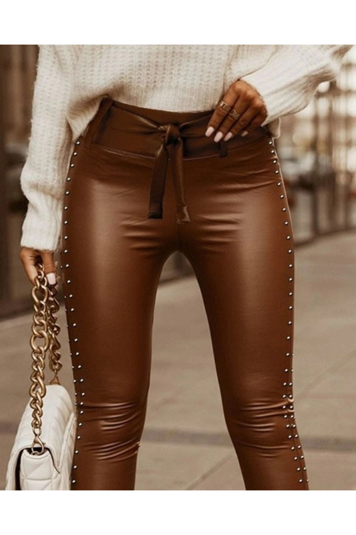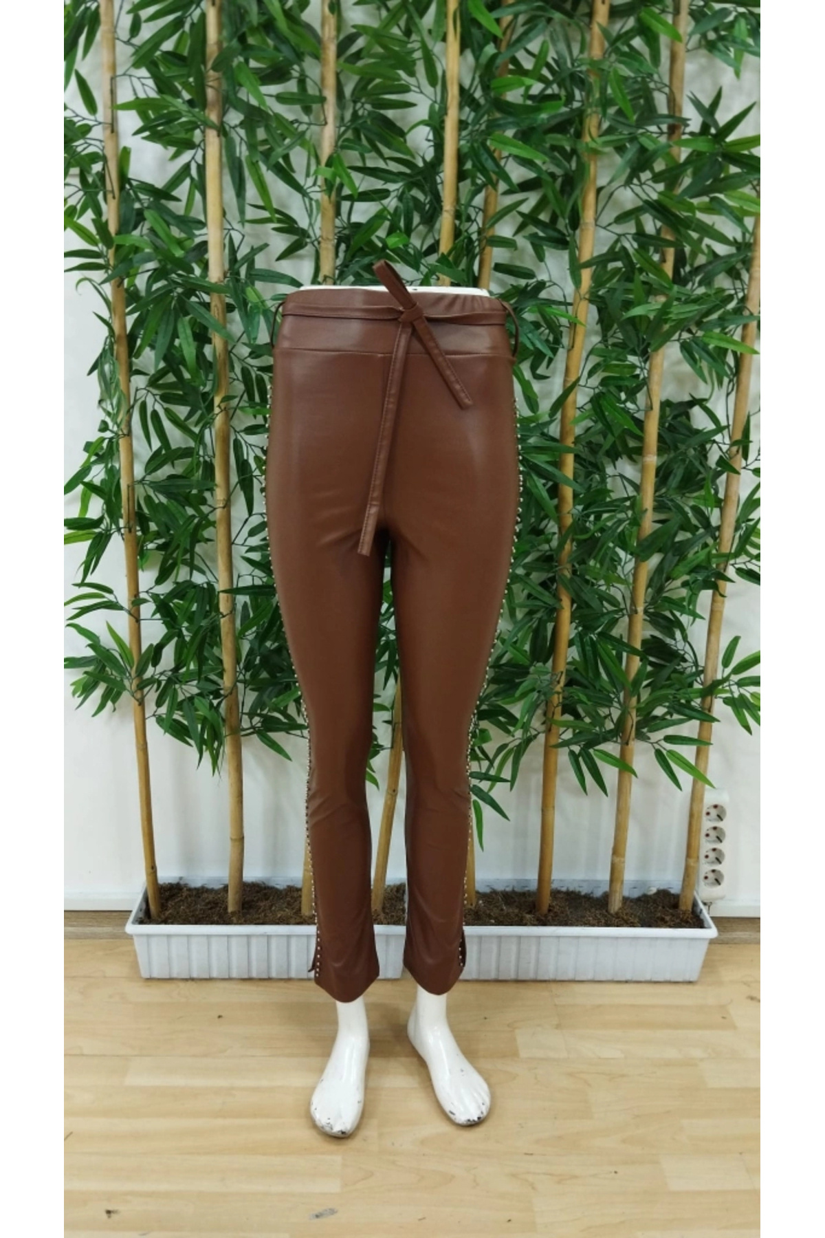 Kadın Yüksek Bel Yanlardan Incili Yırtmaçlı Uzun Deri Tayt Kadın Yüksek Bel Yanlardan Incili Yırtmaçlı Uzun Deri Tayt SRO-173104 Standart