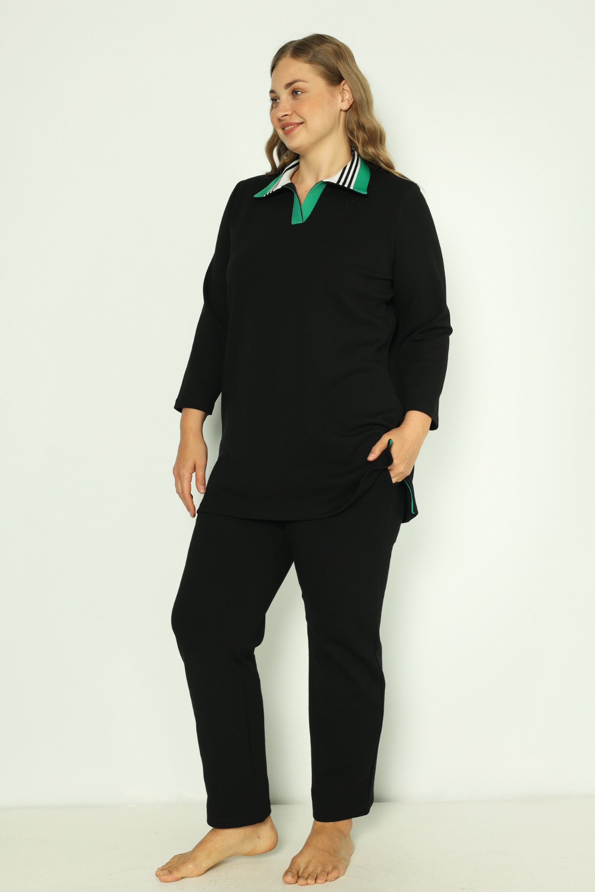 Siyah Kadın Büyük Beden Pamuklu İnterlok Truvakar Kollu Cepli Biyeli Alt-Üst Eşofman Takımı Siyah Kadın Büyük Beden Pamuklu İnterlok Truvakar Kollu Cepli Biyeli Alt-Üst Eşofman Takımı 25007 4XL