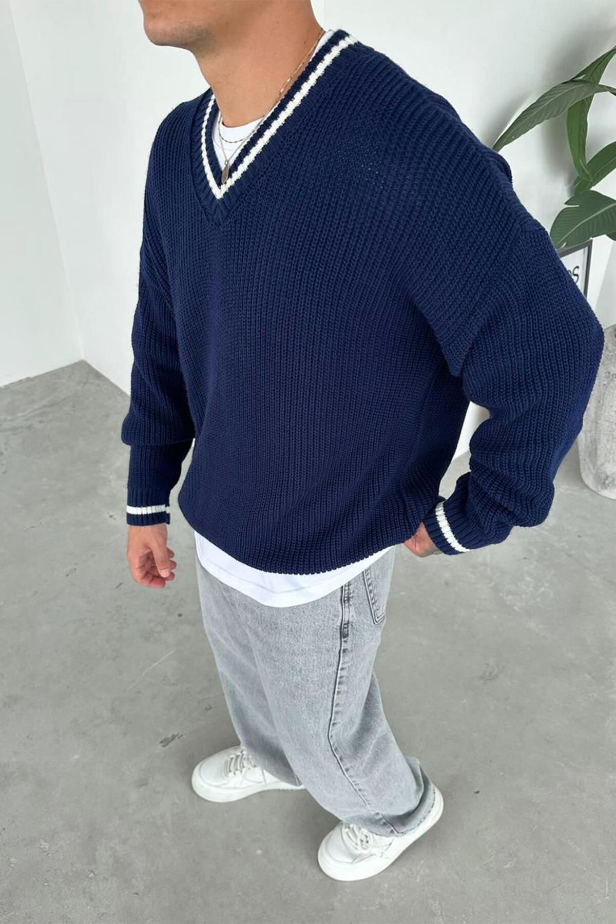 Lacivert V Yaka Çizgili Oversize Triko Kazak Lacivert V Yaka Çizgili Oversize Triko Kazak HF0015-PM-K XL
