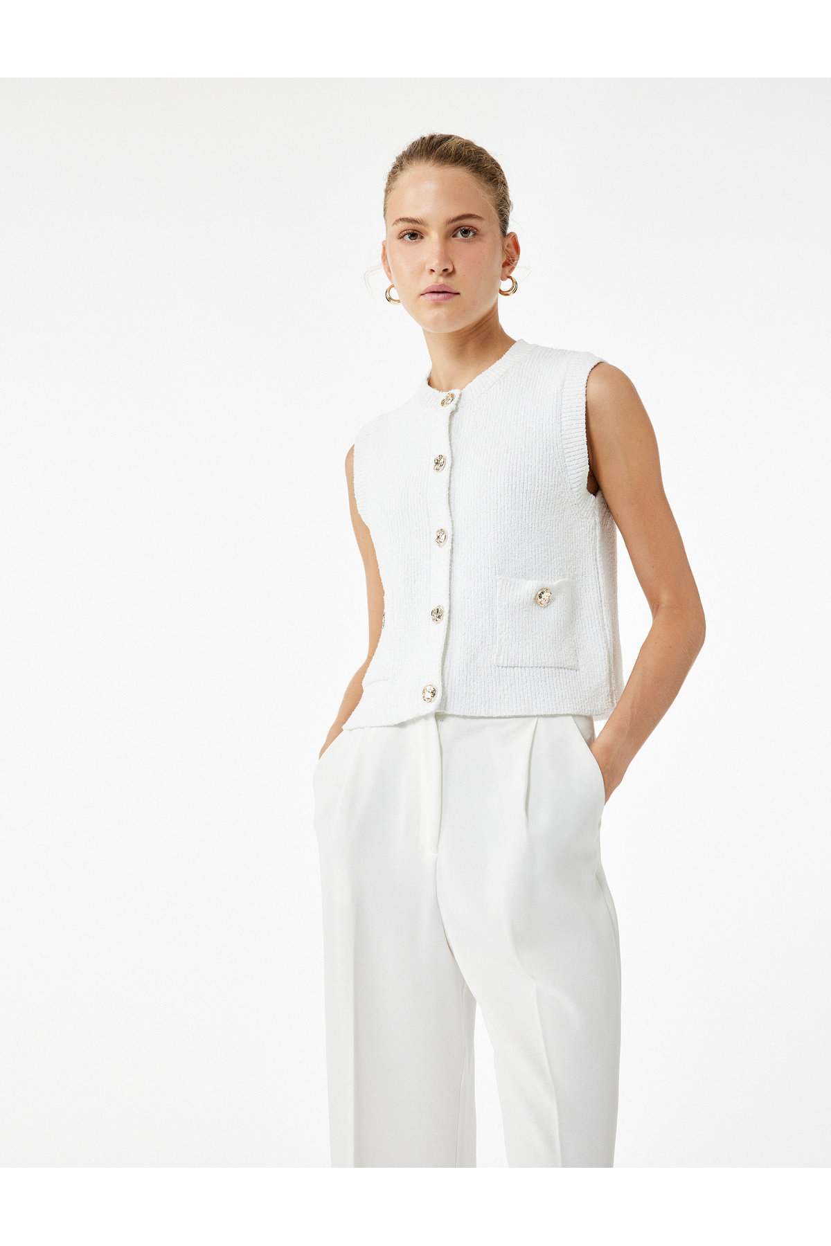 Kolsuz Viskon Karışımlı Cep Detaylı Düğmeli Asimetrik V Yaka Yelek Kolsuz Viskon Karışımlı Cep Detaylı Düğmeli Asimetrik V Yaka Yelek 6WAK20046UW 42