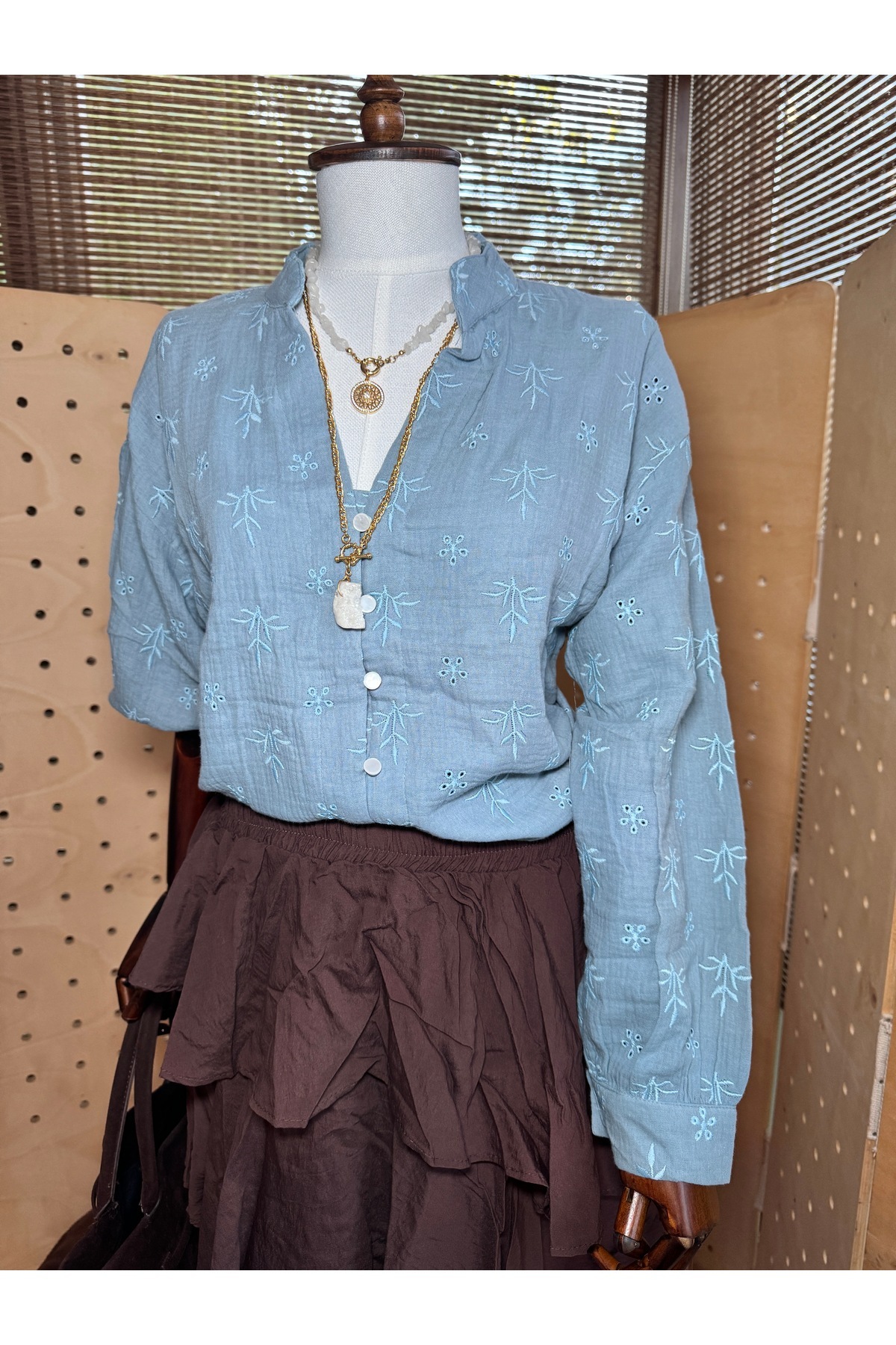 Kadın Mavi Nakışlı Bohem Gömlek – Uzun Kollu Vintage Stil Kadın Mavi Nakışlı Bohem Gömlek – Uzun Kollu Vintage Stil MAVINAKISGOMLEK L