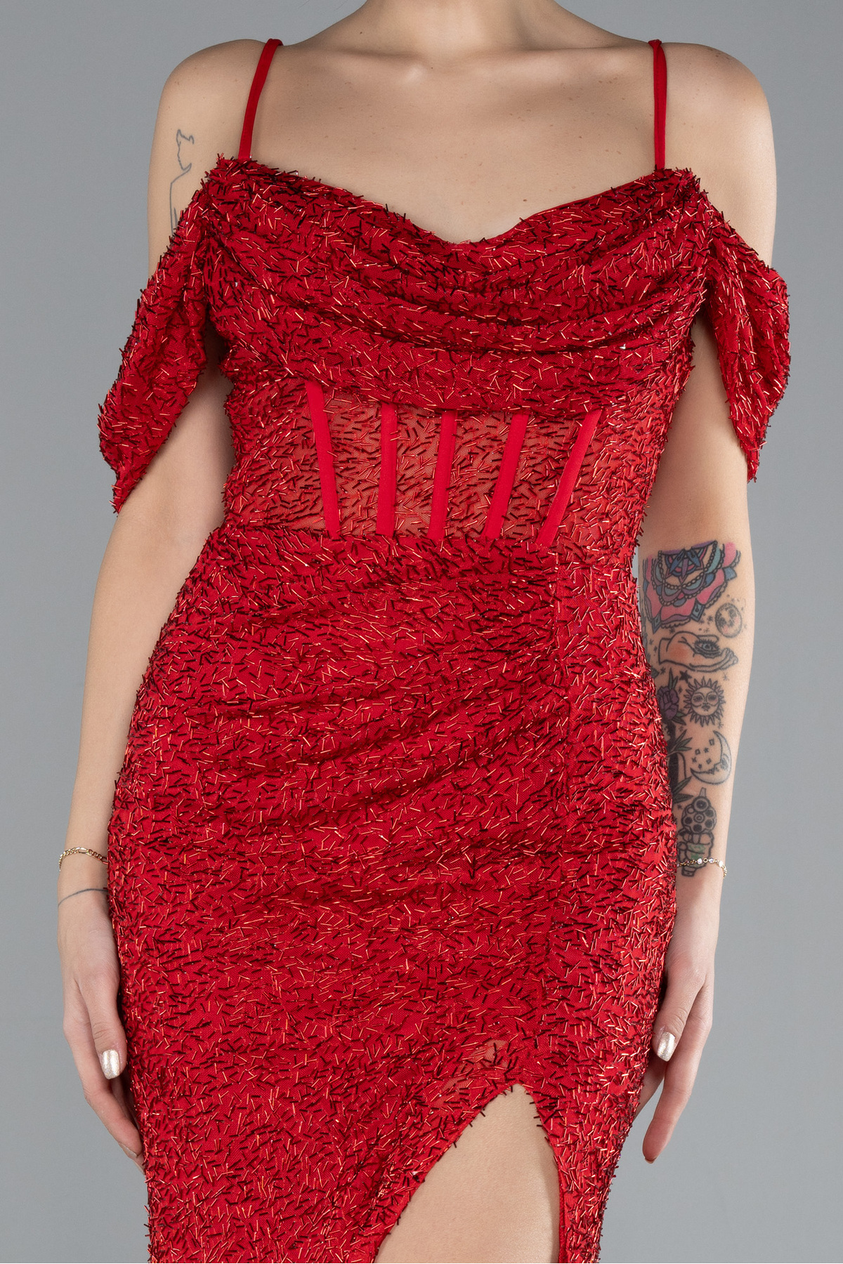 Kırmızı Bacak Ve Omuz Dekolteli Uzun Boncuklu Abiye ABU4394 Kırmızı Bacak Ve Omuz Dekolteli Uzun Boncuklu Abiye ABU4394 44