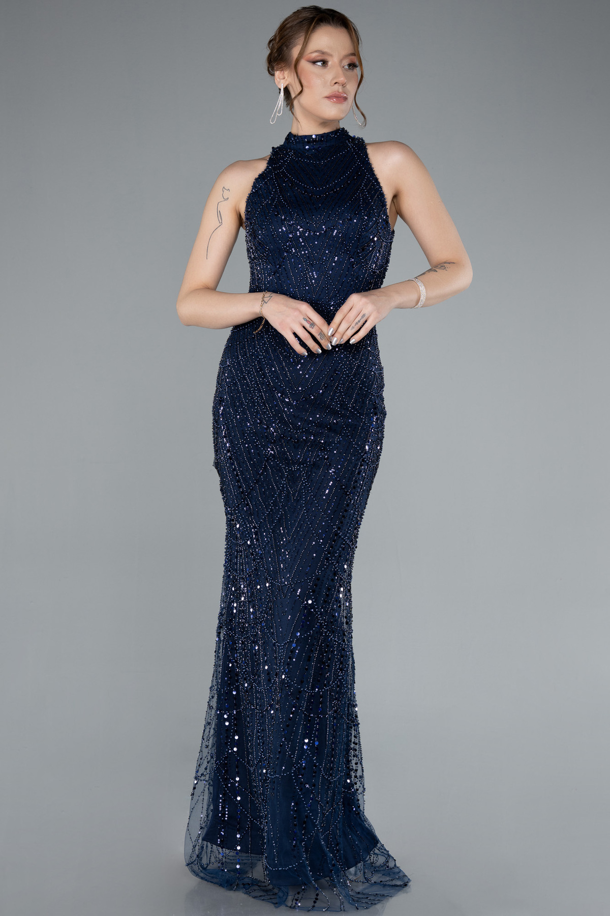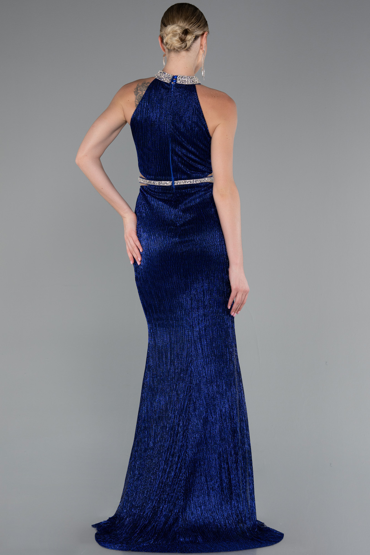 Saks Mavi Halter Yaka Bacak Dekolteli Uzun Simli Abiye ABU4324 Saks Mavi Halter Yaka Bacak Dekolteli Uzun Simli Abiye ABU4324 44