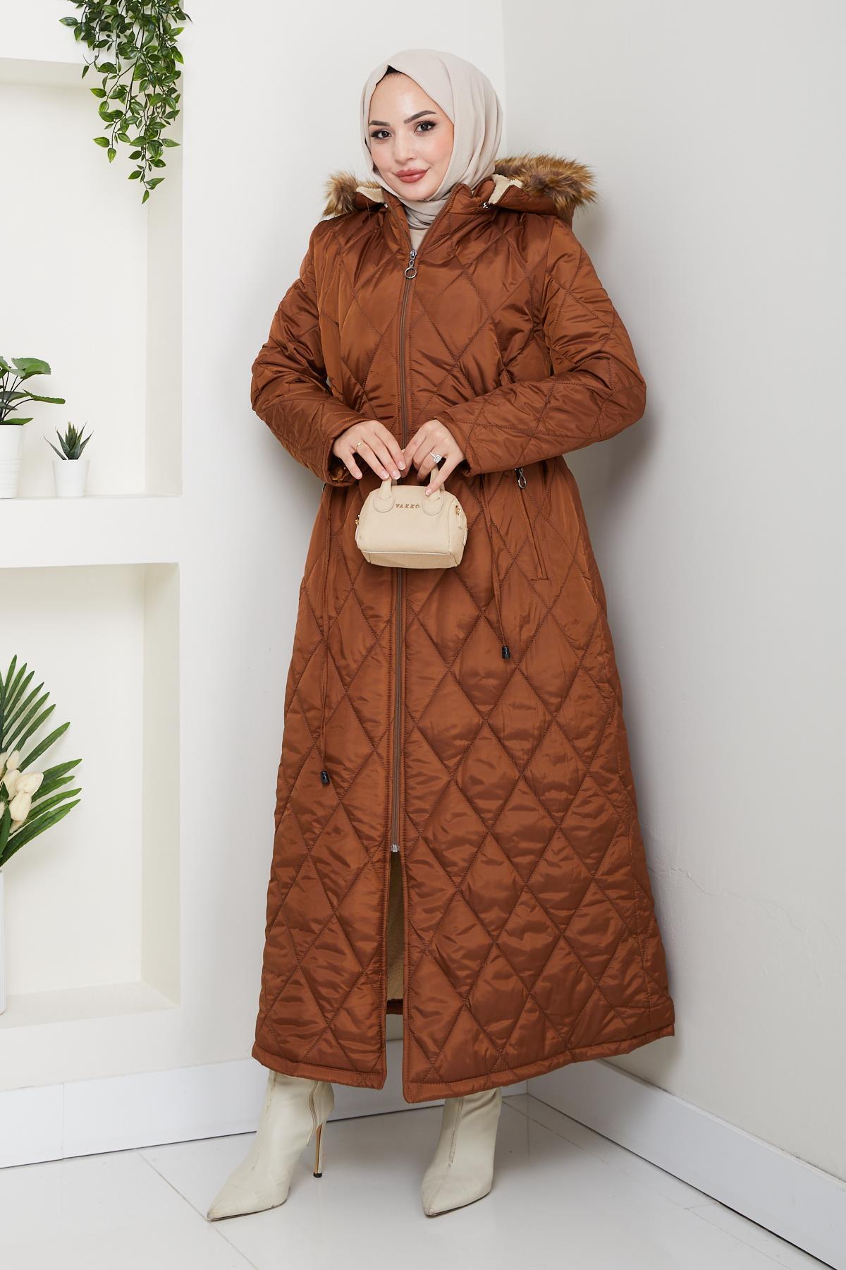 Kadın Uzun İçi Kürklü Kapişonlu Turuncu Kapitone Mont Kadın Uzun İçi Kürklü Kapişonlu Turuncu Kapitone Mont 77777 42