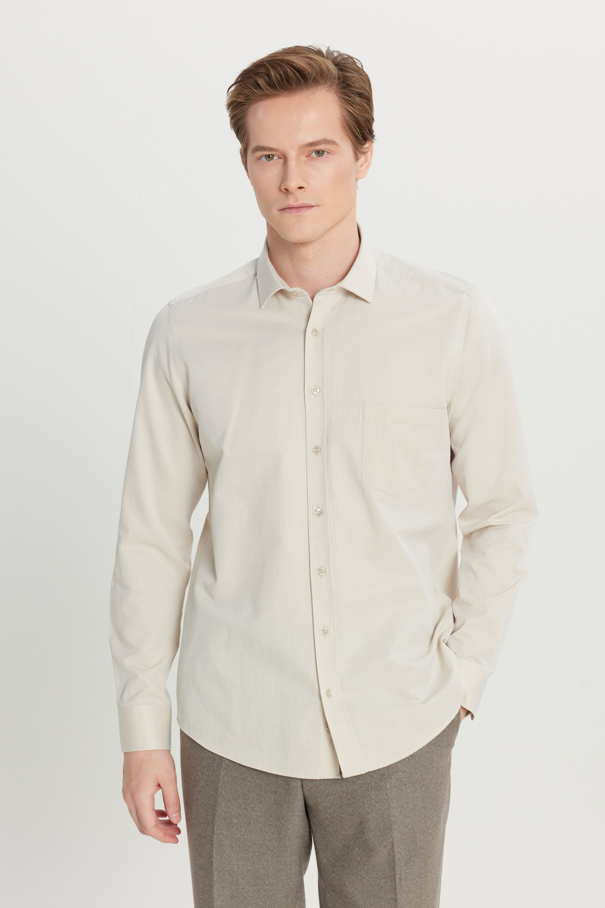 Erkek Bej Pamuklu Tailored Slim Fit Dar Kesim Klasik Yaka Armürlü Cepli Gömlek Erkek Bej Pamuklu Tailored Slim Fit Dar Kesim Klasik Yaka Armürlü Cepli Gömlek ETE020261591 2XL
