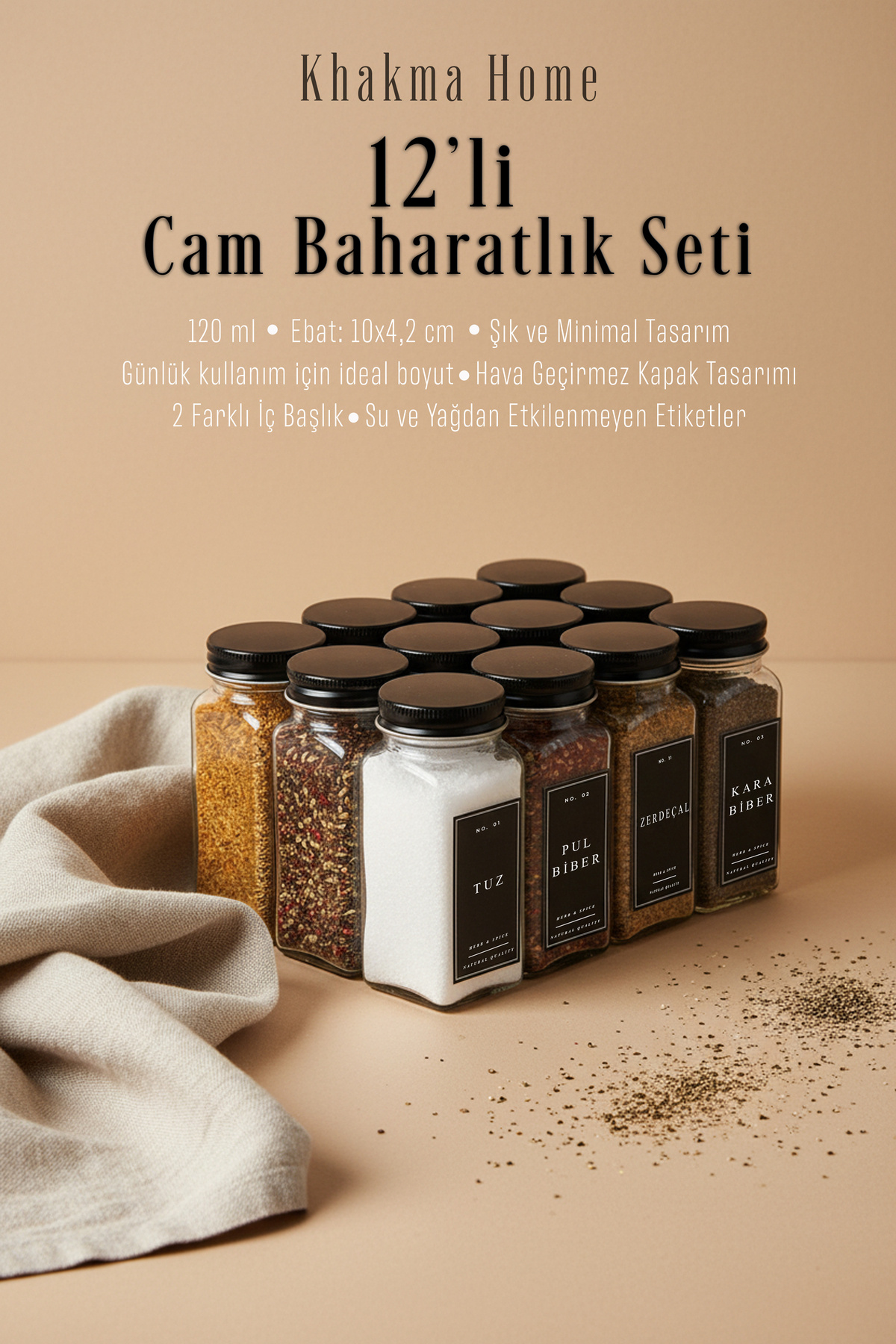 Ahşap Standlı 12'li Cam Baharatlık Seti | 120 ml | Gümüş Kapak Beyaz Etiket | Minimal Tasarım Ahşap Standlı 12'li Cam Baharatlık Seti | 120 ml | Gümüş Kapak Beyaz Etiket | Minimal Tasarım 12'Lİ GÜMÜŞ STANDLI تک سایز