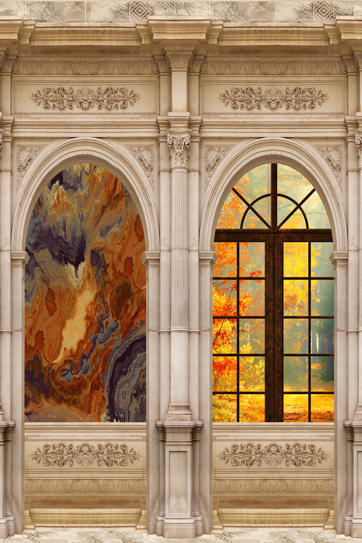 Kemerli Saray Tasarımlı Pencere İllüzyonlu Tekstil Duvar Kağıdı Kemerli Saray Tasarımlı Pencere İllüzyonlu Tekstil Duvar Kağıdı DW2025-678 450 x 240