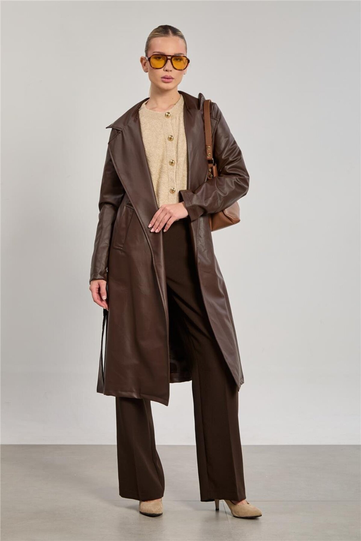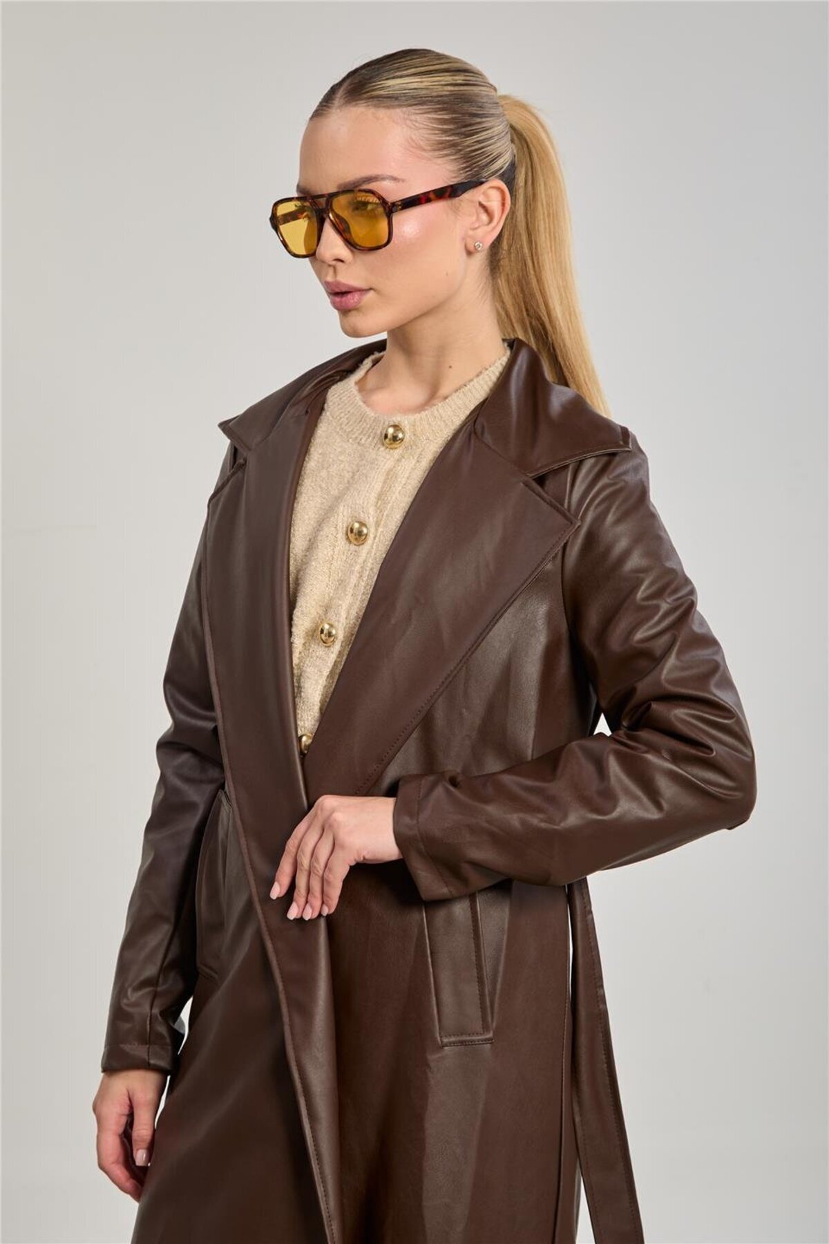 Kadın Deri Görünümlü Suni Trençkot - Acı Kahve Kadın Deri Görünümlü Suni Trençkot - Acı Kahve 1015-25K002 L