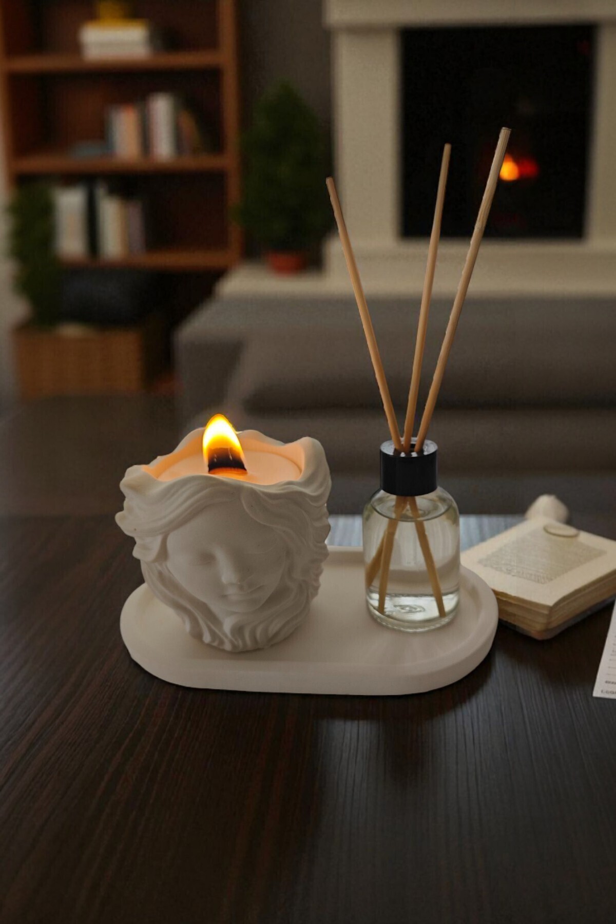 Dekoratif Helenistik Kase İçinde Ahşap Fitil Mum,Tepsi Ve Pudra Oda Kokusu 3'lü Set Dekoratif Helenistik Kase İçinde Ahşap Fitil Mum,Tepsi Ve Pudra Oda Kokusu 3'lü Set evrohelenistik تک سایز