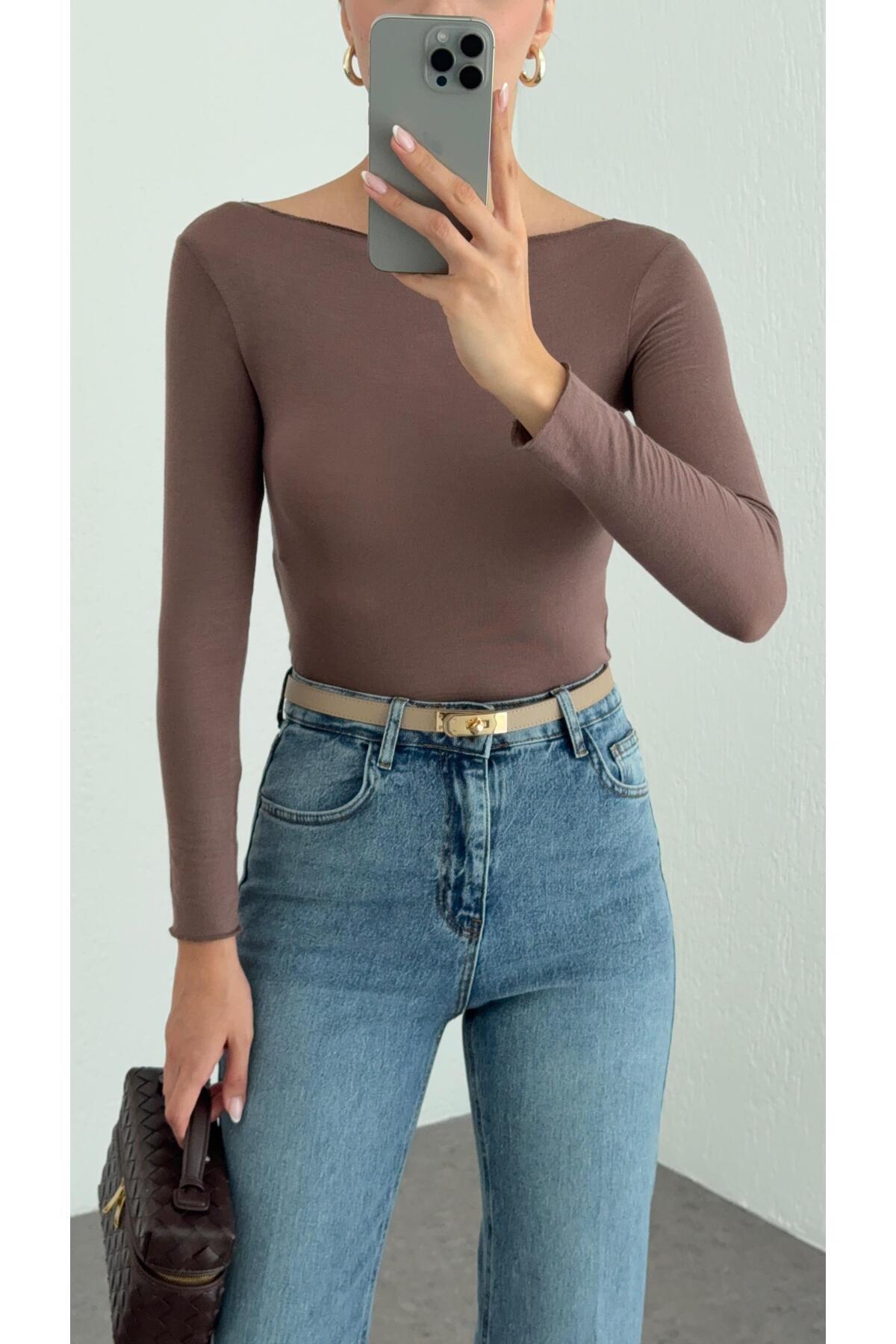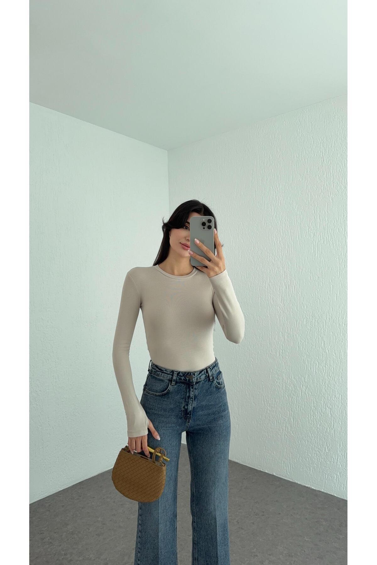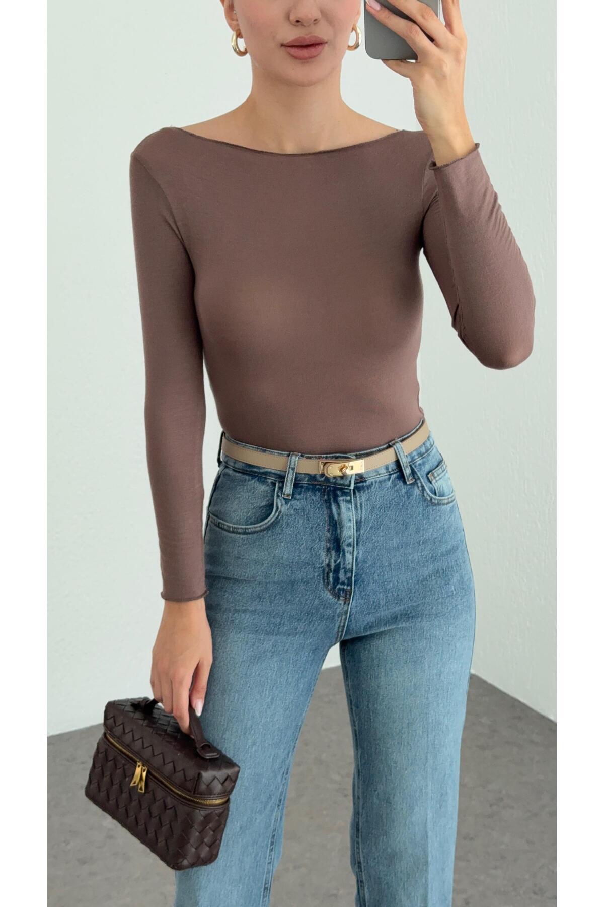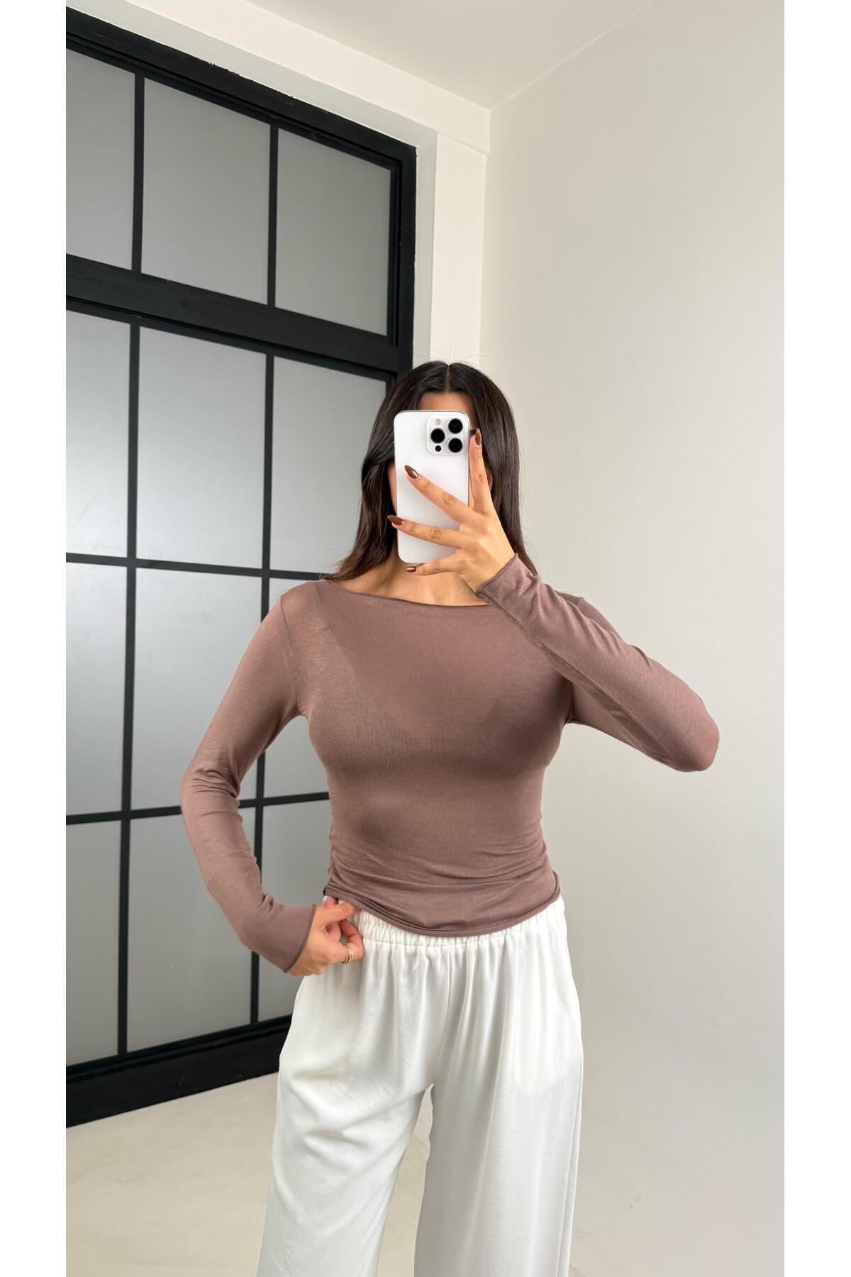 Kayık Yaka Transparan Modal Vizon Basic Bluz Kayık Yaka Transparan Modal Vizon Basic Bluz 11995 L