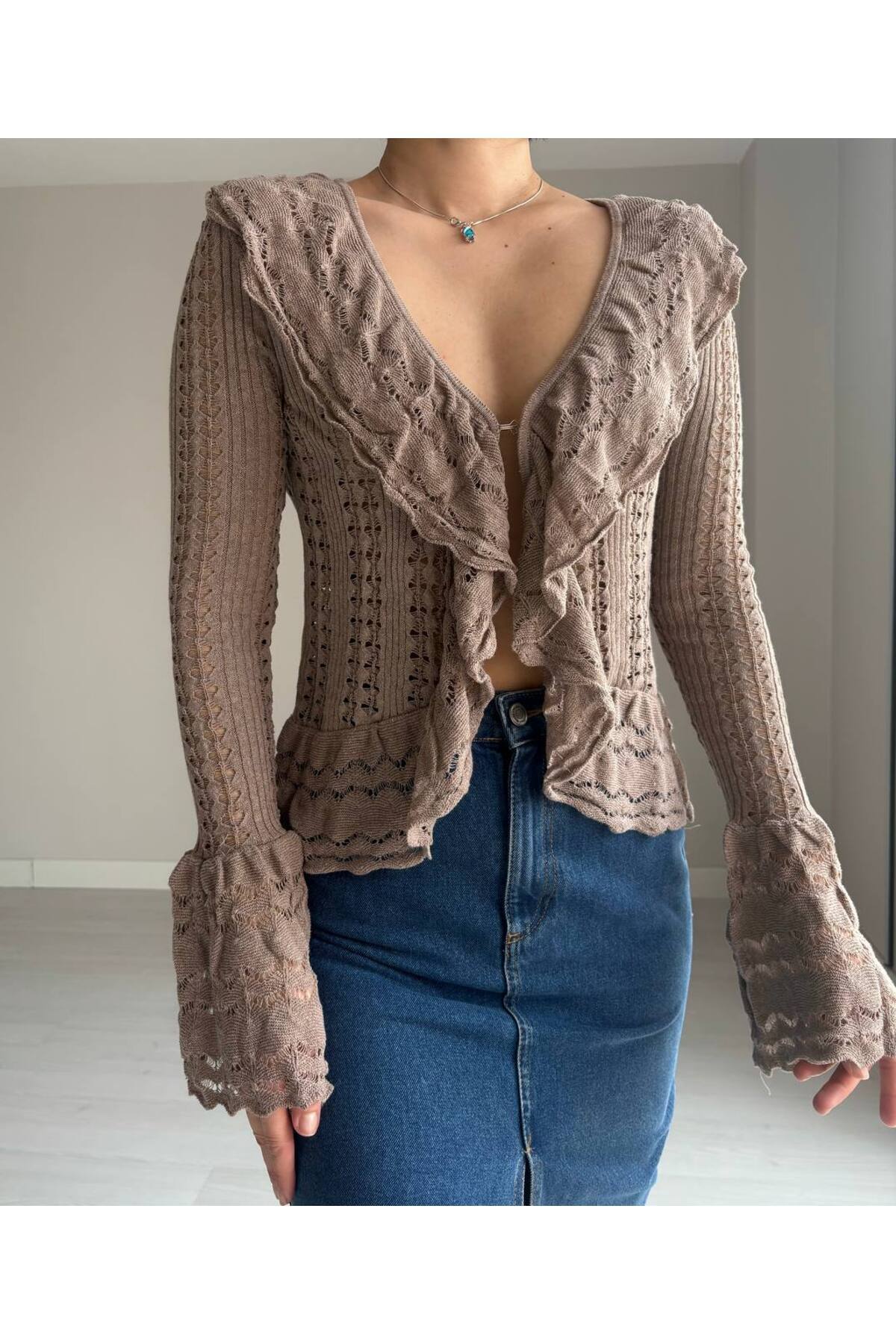 Kadın Fırfır Yaka İsoanyol Kol Detaylı Triko Hırka Kadın Fırfır Yaka İsoanyol Kol Detaylı Triko Hırka m48485858mt Standart
