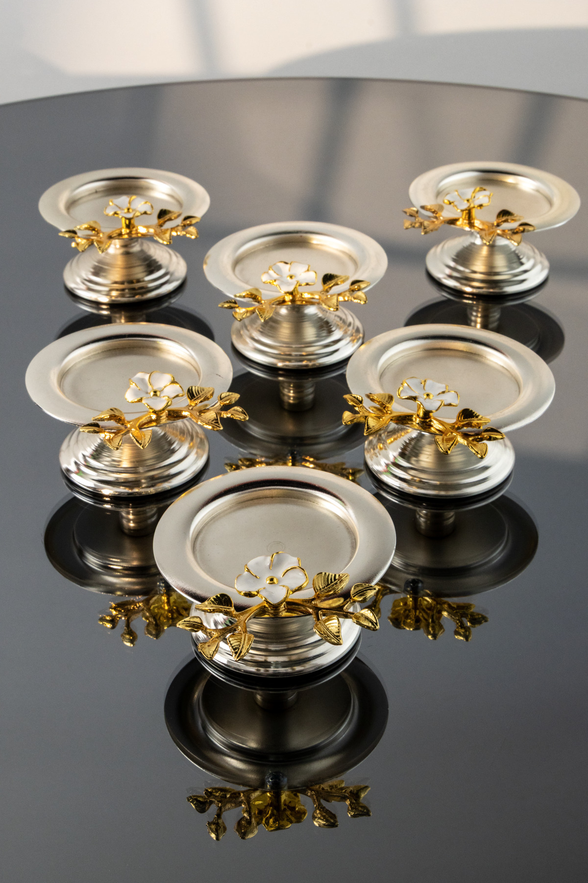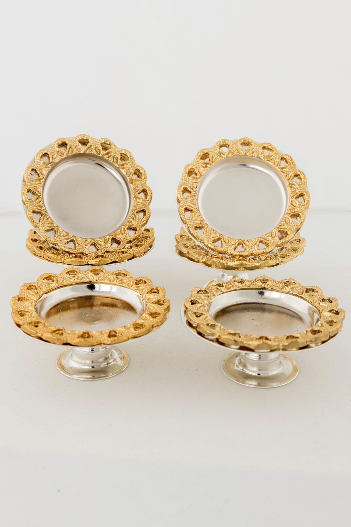 Gümüş Metal Kaplama Kahve Yanı Lokumluk | Ayaklı, Gold Çiçek Çerçeveli Şık Sunumluk Gümüş Metal Kaplama Kahve Yanı Lokumluk | Ayaklı, Gold Çiçek Çerçeveli Şık Sunumluk YRN2162 تک سایز