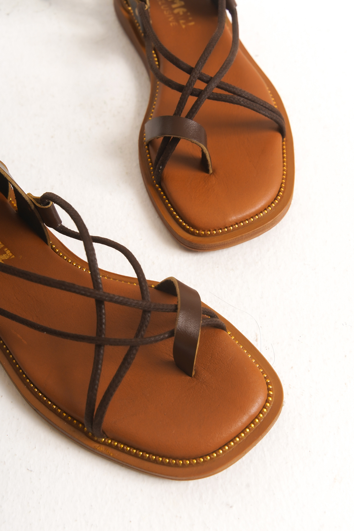 - Kadın Hakiki Deri Parmak Arası İpli Bilekten Bağlamalı Kahve Sandalet - Kadın Hakiki Deri Parmak Arası İpli Bilekten Bağlamalı Kahve Sandalet AA311YE 40