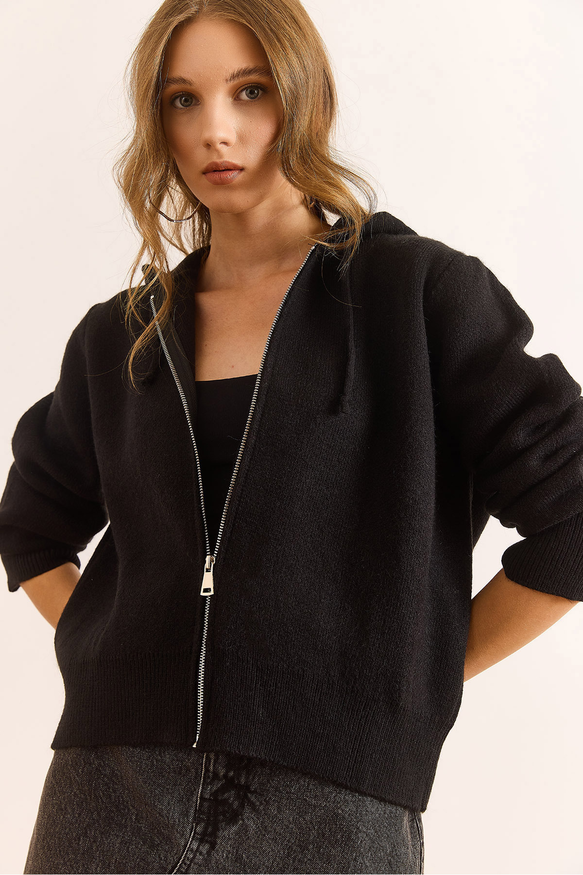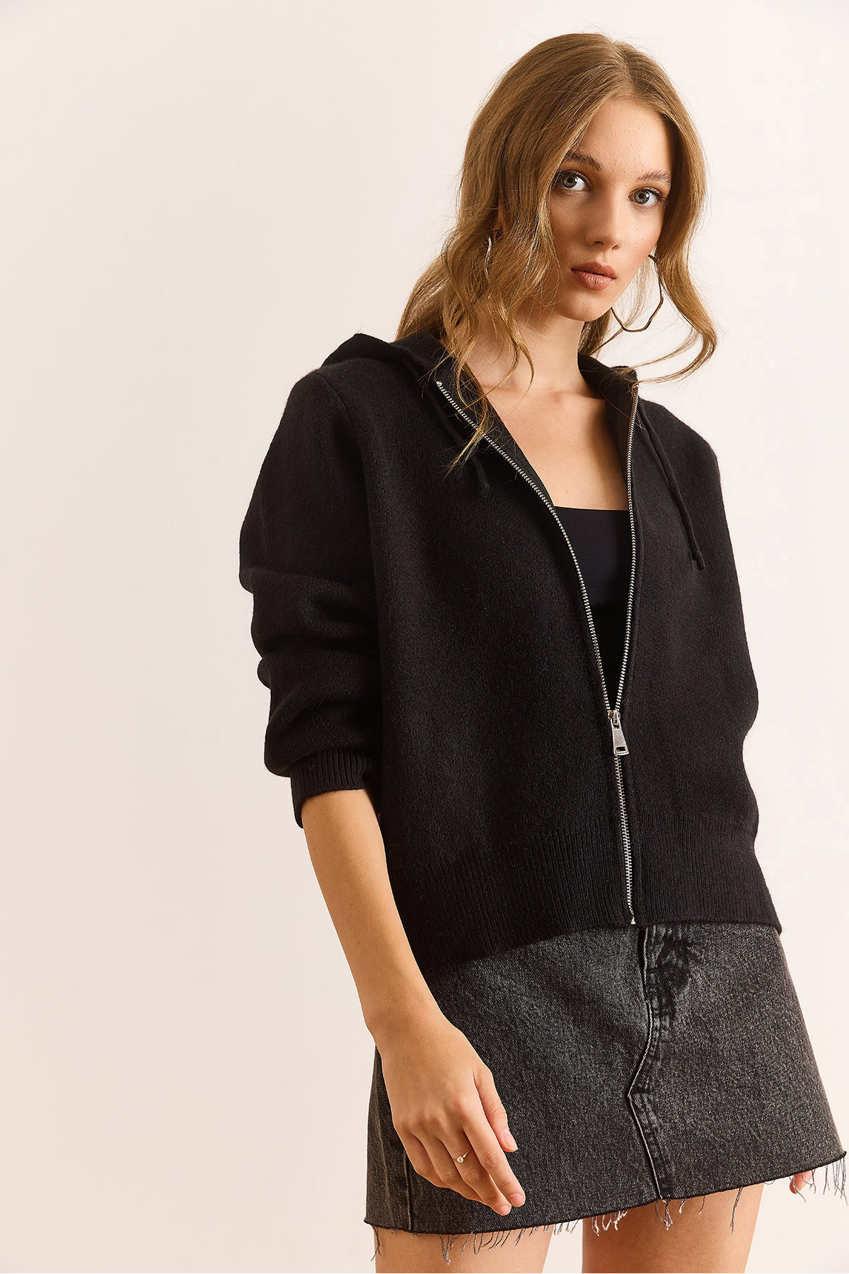 Kadın Siyah Kapüşonlu Fermuarlı Yumuşak Dokulu Kalın Triko Hırka Ceket CKT-19000469 Kadın Siyah Kapüşonlu Fermuarlı Yumuşak Dokulu Kalın Triko Hırka Ceket CKT-19000469 تک سایز