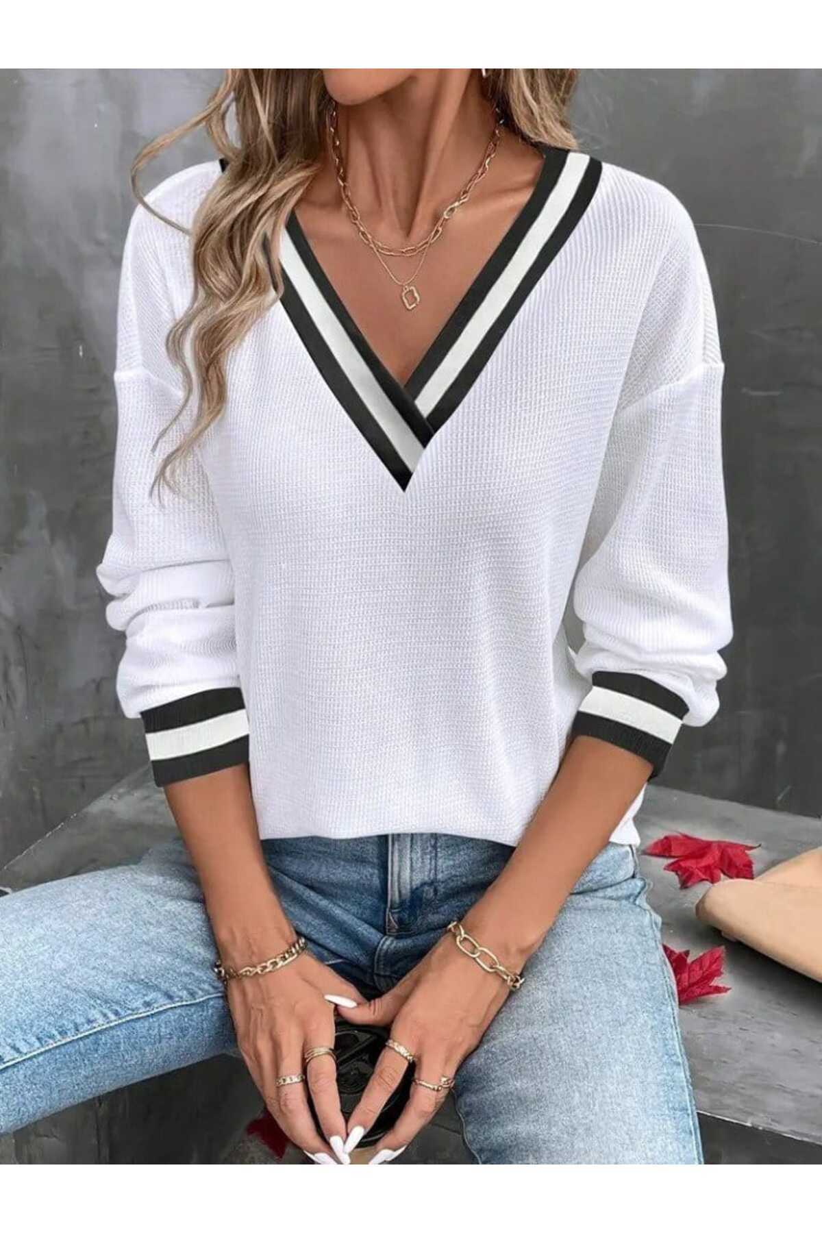 Kadın V Yaka Şerit Detaylı Waffle Bluz Kadın V Yaka Şerit Detaylı Waffle Bluz ROT-89030-MN 2XL-3XL