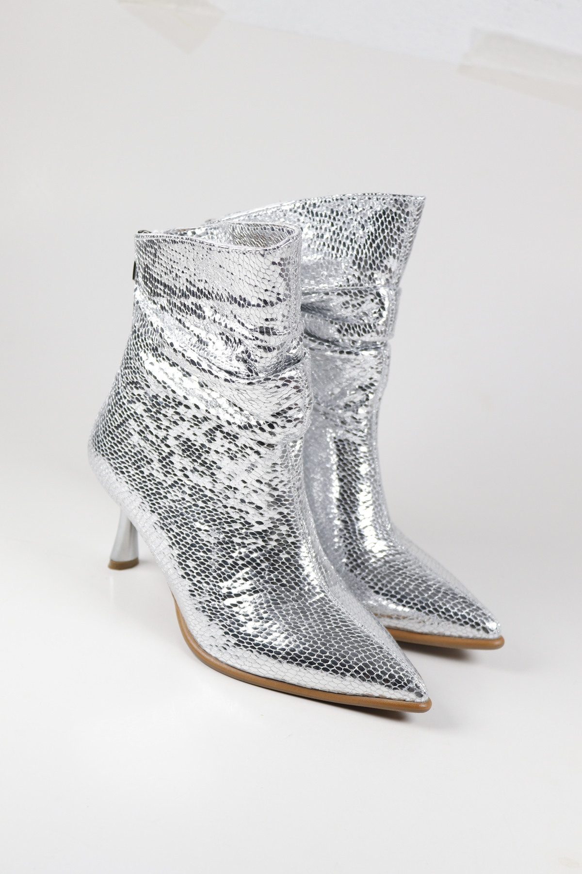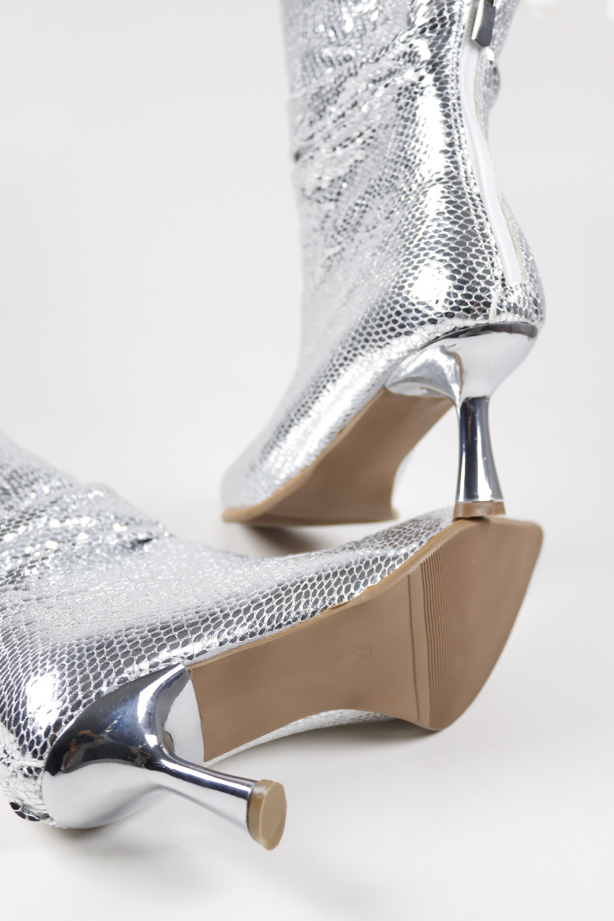 Kadın İnce Topuklu Gümüş Yılan Derisi Sivri Burunlu Bot Kadın İnce Topuklu Gümüş Yılan Derisi Sivri Burunlu Bot 2005FO 40