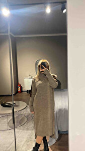 Yarım Balıkçı Yaka Kolda Şerit Detaylı Çift Yırtmaçlı Önü Kısa Arkası Uzun Model Triko Elbise Yarım Balıkçı Yaka Kolda Şerit Detaylı Çift Yırtmaçlı Önü Kısa Arkası Uzun Model Triko Elbise BCH-TE XL
