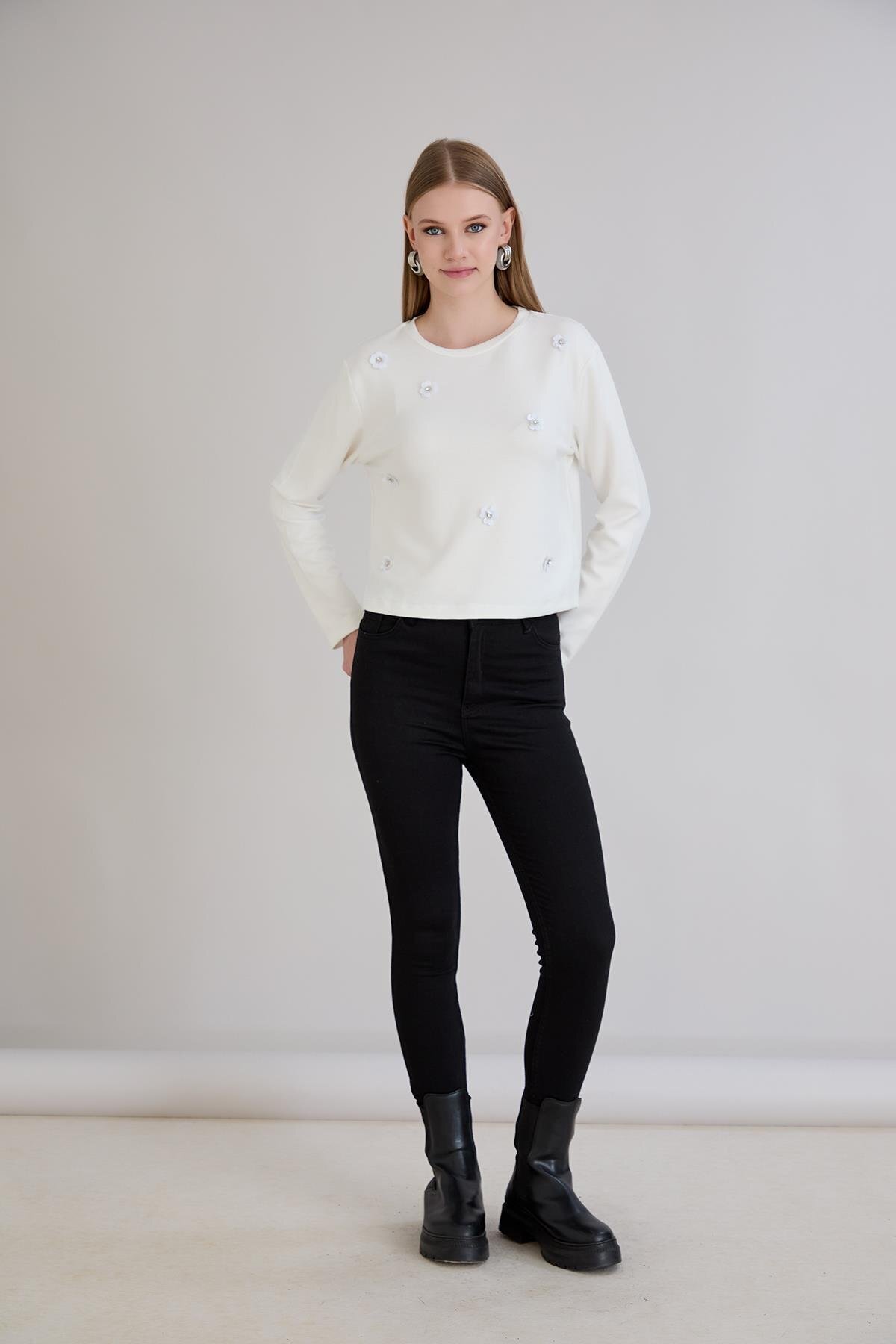 Kadın Üç Boyutlu Çiçek Aksesuarlı Bisiklet Yaka Ekru Renk Modal Bluz Kadın Üç Boyutlu Çiçek Aksesuarlı Bisiklet Yaka Ekru Renk Modal Bluz 1096 XL