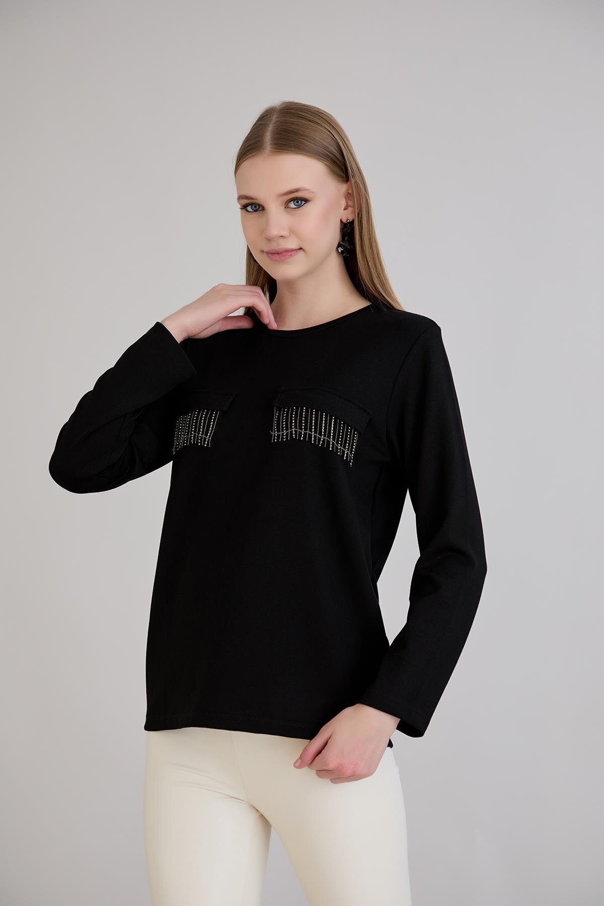Kadın Cebi Taşlı Midi Boy Bisiklet Yaka Modal Siyah Bluz Kadın Cebi Taşlı Midi Boy Bisiklet Yaka Modal Siyah Bluz 1094 XL