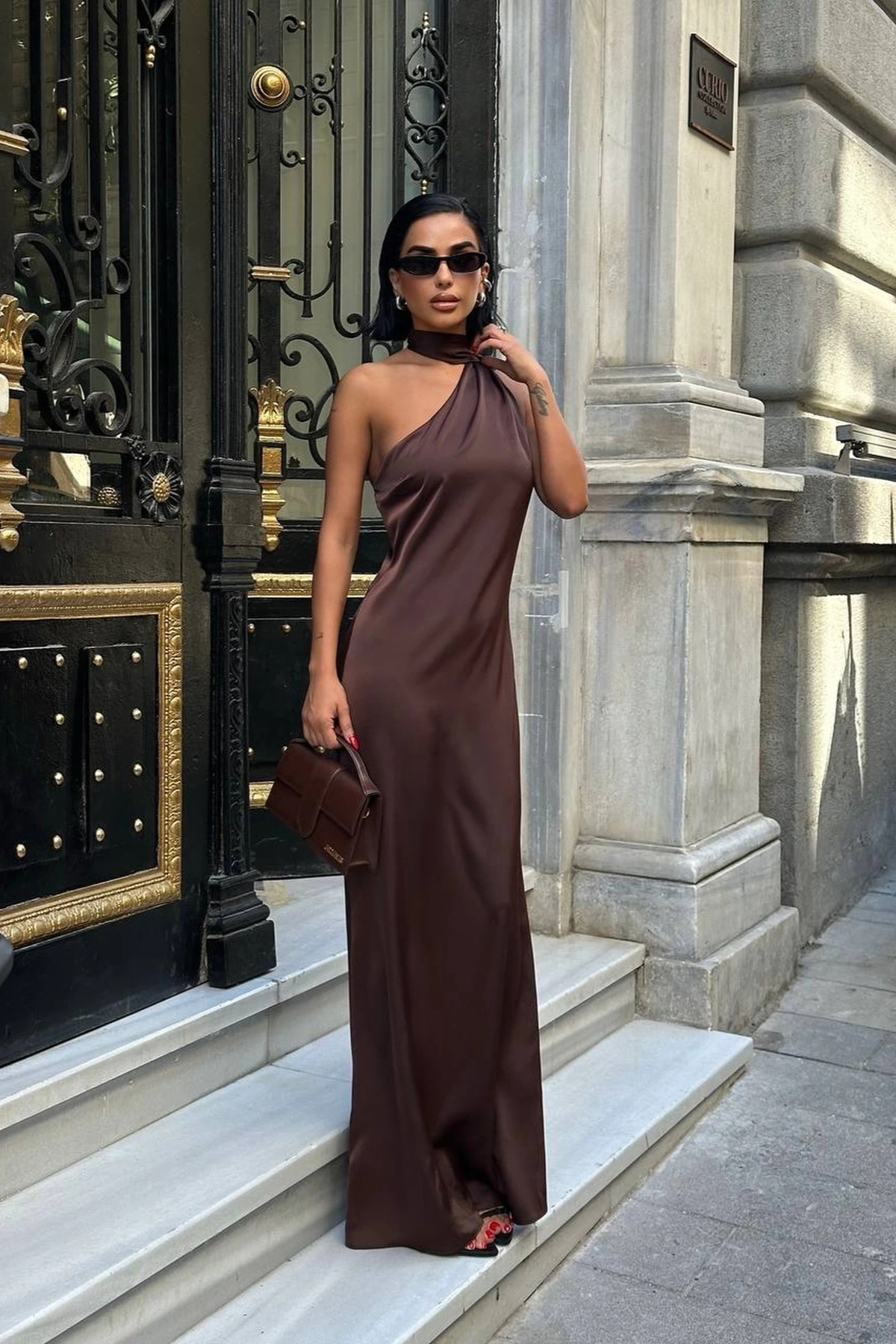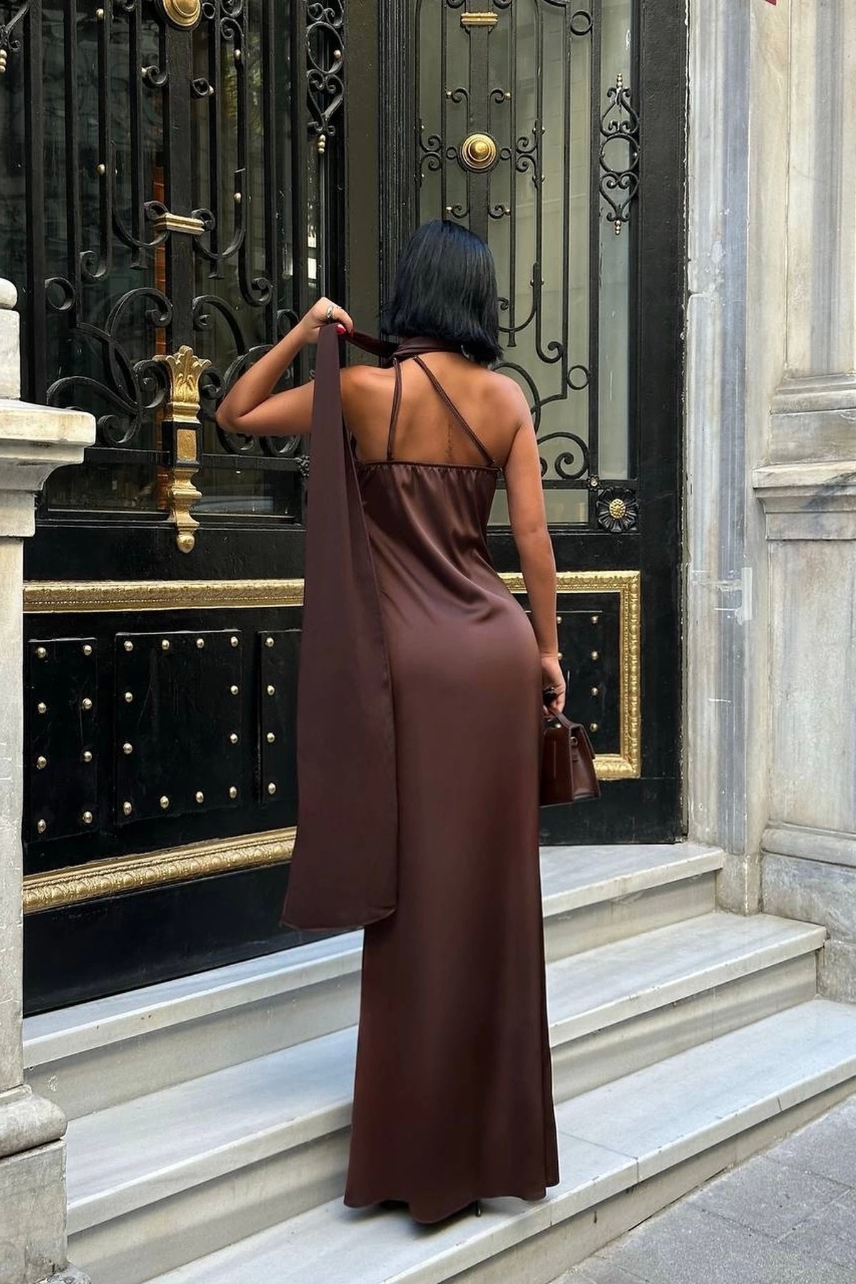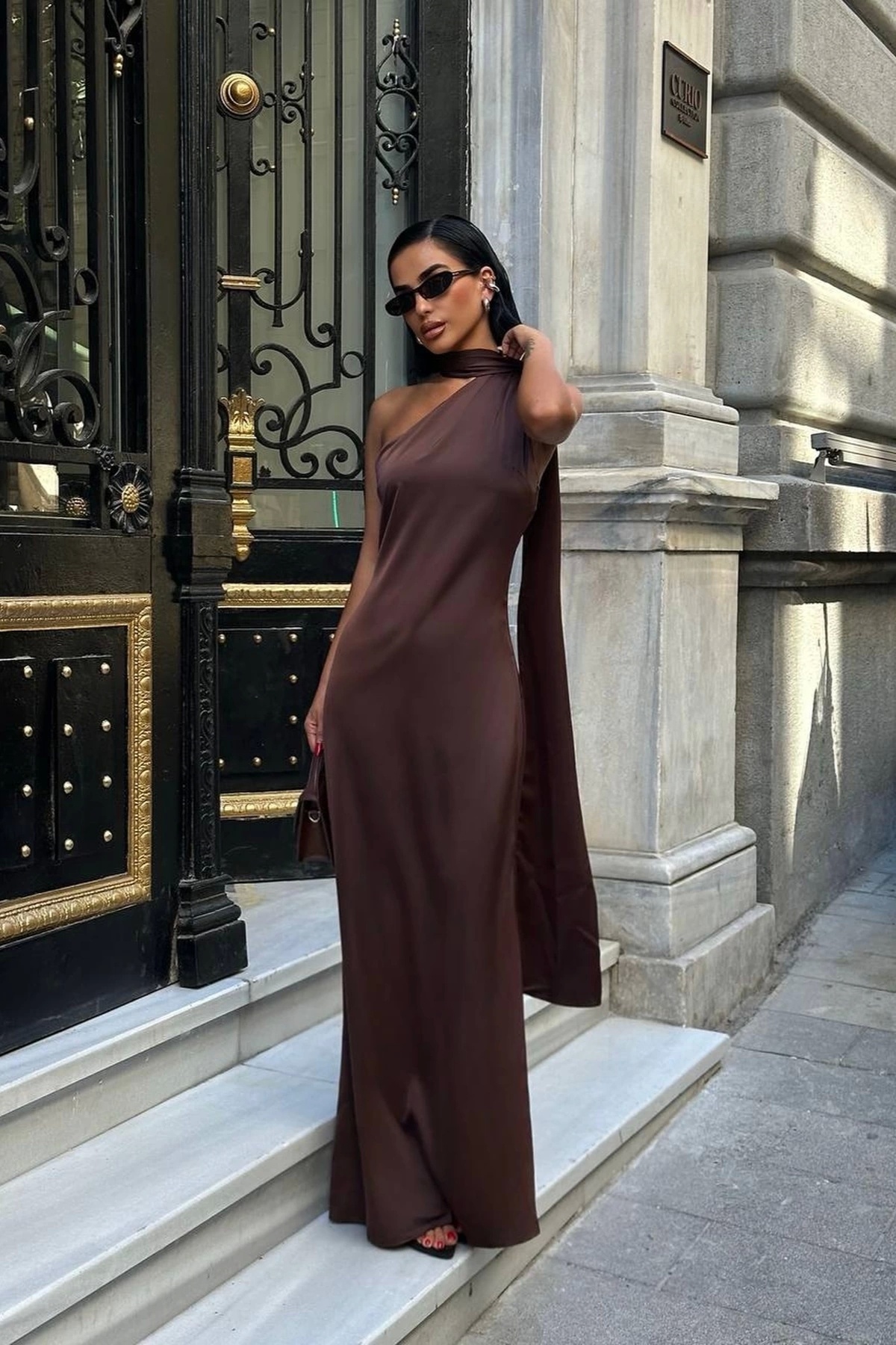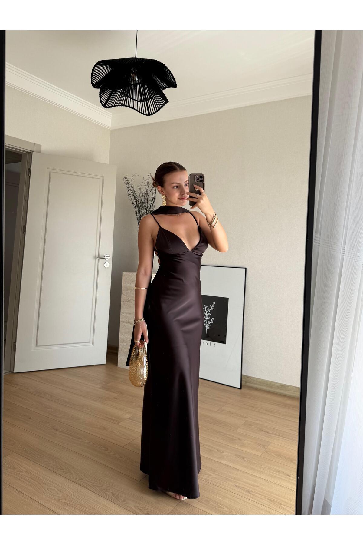 Kadın Premium Tek Omuz Şal Detaylı Saten Maxi Elbise – Kahverengi Kadın Premium Tek Omuz Şal Detaylı Saten Maxi Elbise – Kahverengi VK1757 L