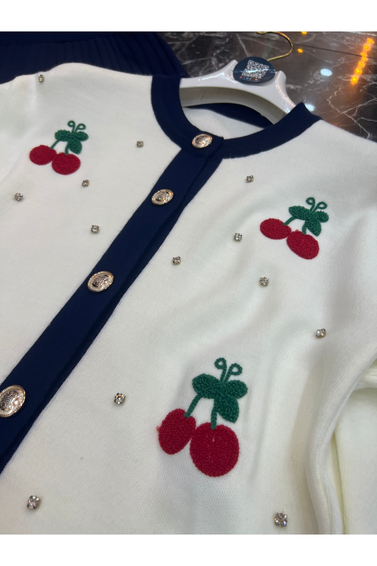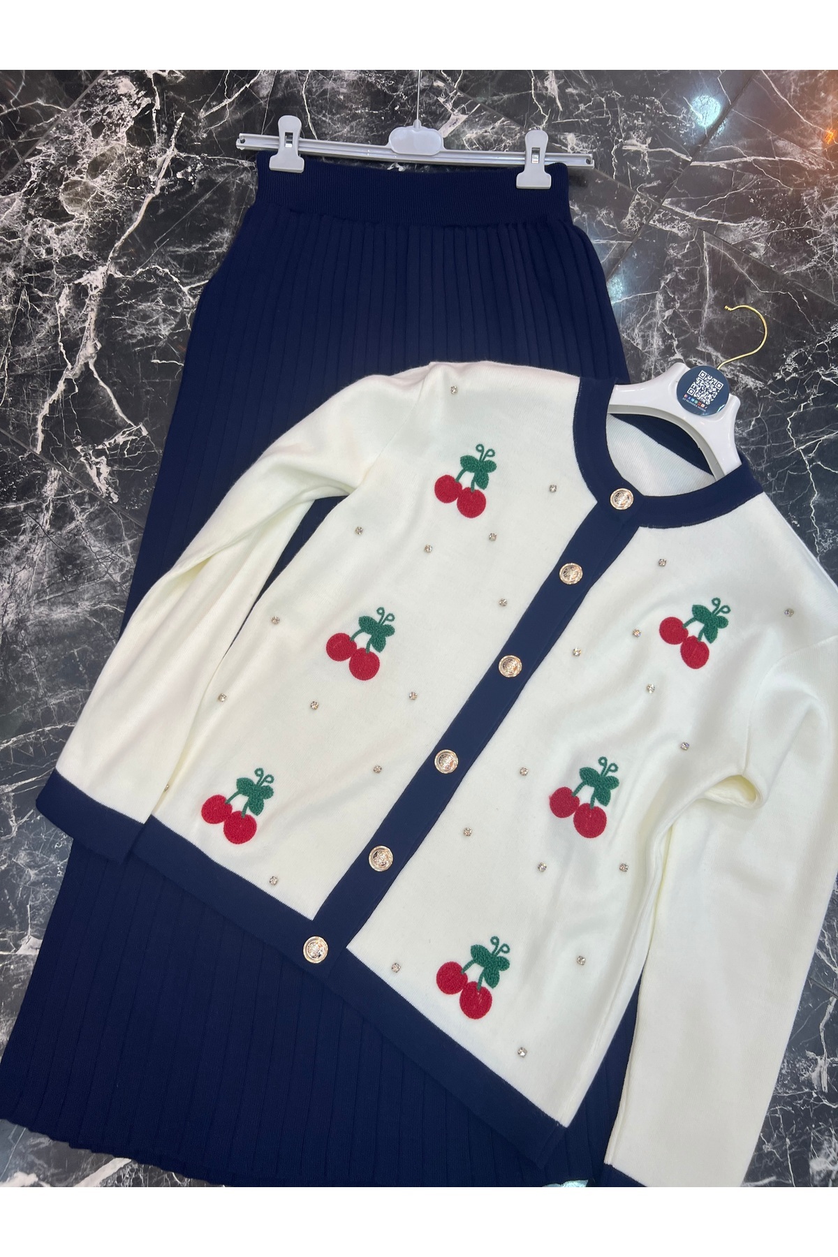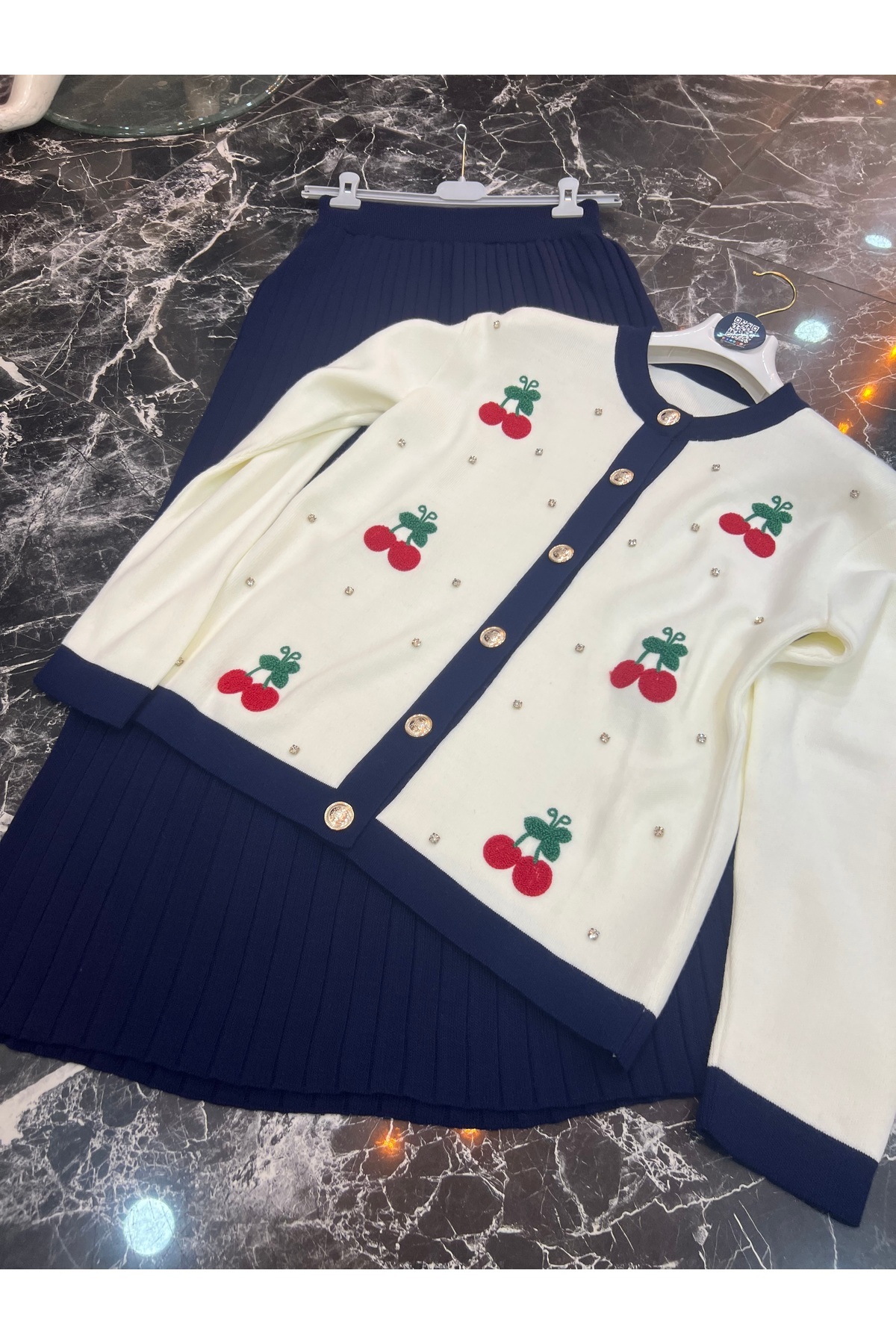 Kadın Tesettür Triko Takım Kiraz Nakışlı Hırka Etekli Alt üst Takım Lacivert Kadın Tesettür Triko Takım Kiraz Nakışlı Hırka Etekli Alt üst Takım Lacivert 401 تک سایز