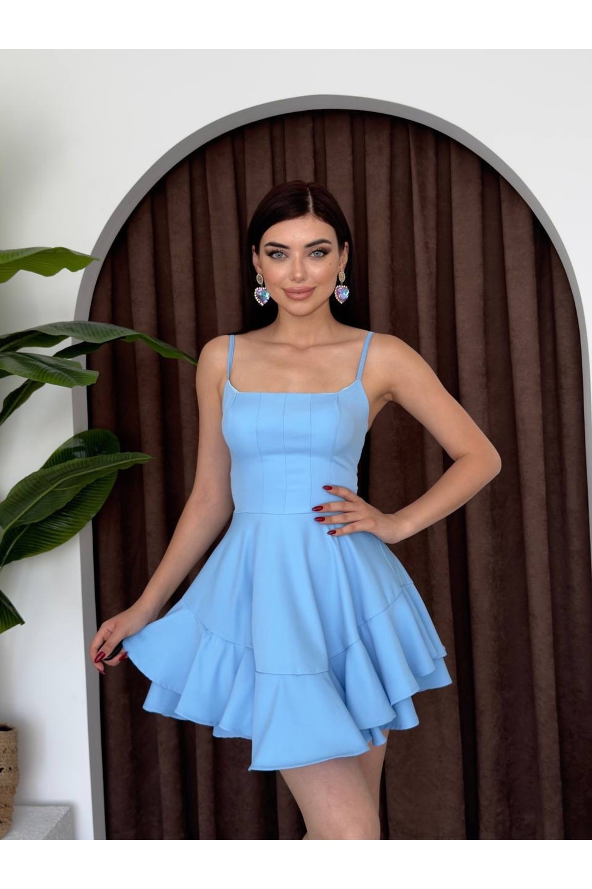Askılı Volanlı Eteği Belden Açılan Fırfırlı Mini Elbise Askılı Volanlı Eteği Belden Açılan Fırfırlı Mini Elbise VE0022 L
